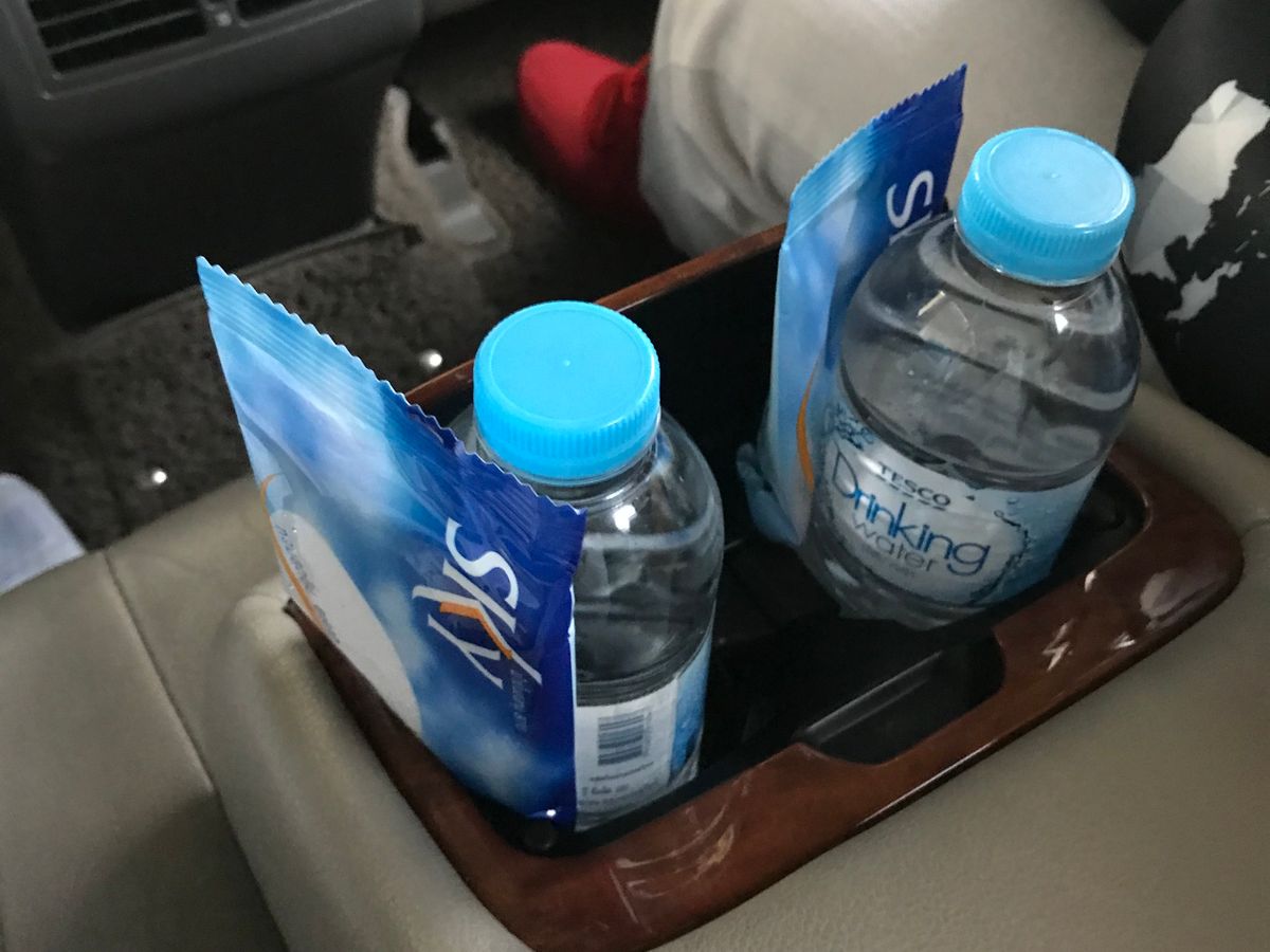 助手席に ミネラルウォーターが置いてあるのがみえました。この ミネラルウォーターは自分で自由にとるものだったんですね。体験談を書くにあたってプランの詳細を再確認した所、案内・詳細にそう書いてありました。よって