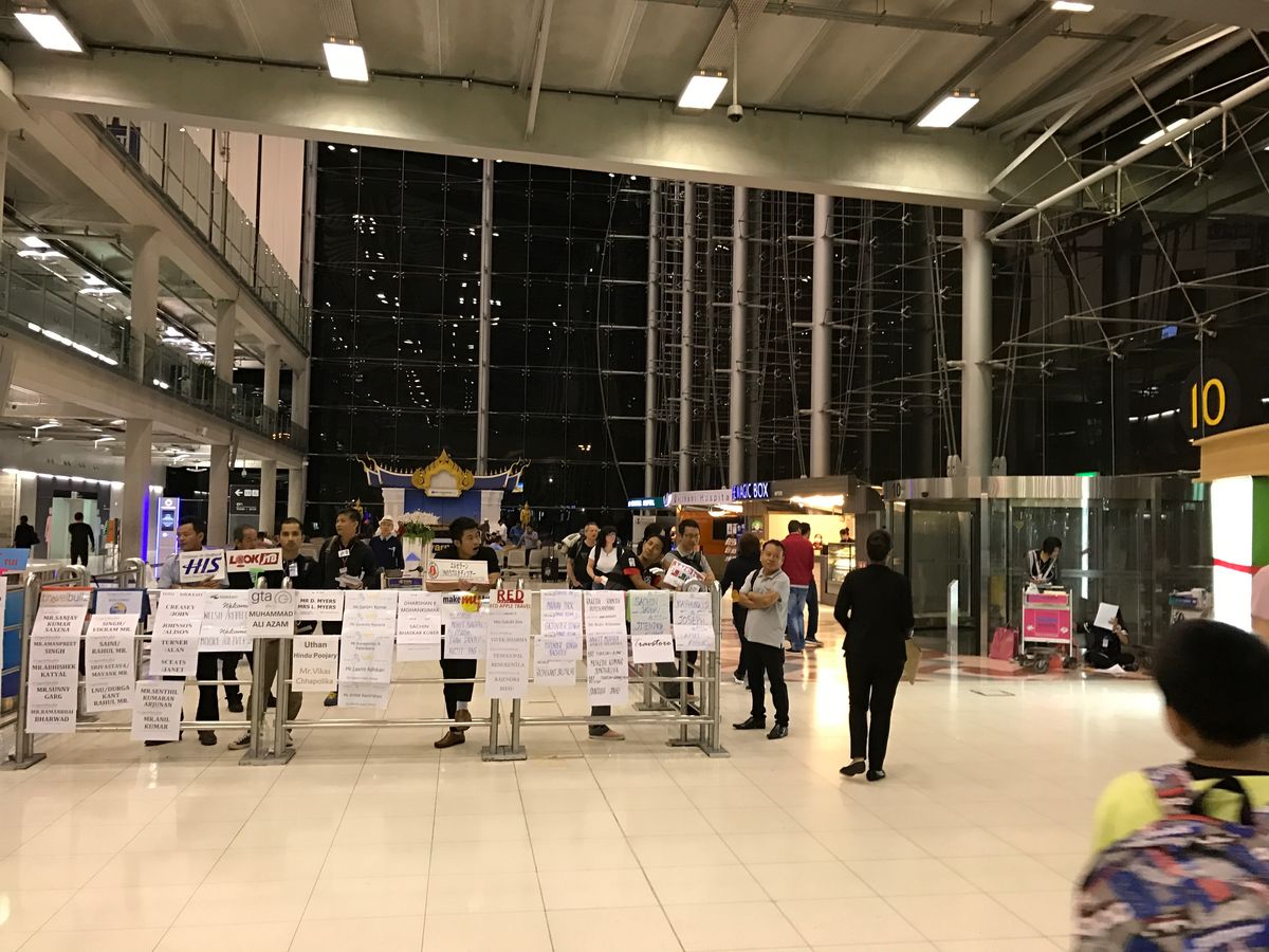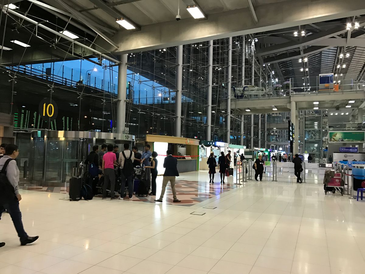 待ち合わせ時間より早く来たのだが、ワゴンは傷だらけ、運転手は髪を束ねたTシャツスタイル。おまけにスピードを出すものだから怖いのなんのって。幸い事故も無く、おかげで35~40分でスワンナプーム国際空港に着き、それ自体は良いのだが、搭乗手続き開始まで、1時間以上待つ羽目になってしまった。これは混雑を予想して、早めにお願いしたこちらにも責任があるけれど。