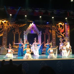 予約をしたら後は自分たちで会場まで行くようです。それがわからず、船着場からうろうろしてしまいました。場所はニューハーフショーと同じシアターで、船着場と反対側にあります。タイ舞踊は2階です。チケット売り場の予約用の窓口で名前を言って確認できると入場券のようなものを渡されます。2階に上がると日本の旗のテーブルに案内され、セットメニューのタイ料理が運ばれてきます。ショー自体は7時からと8時半からの2回で45分間でした。途中役者さんが席を回ってくれて写真も撮れ、お得だと思います。