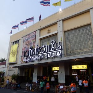 ラチャダムヌン・ムエタイ・スタジアムは、宿をとっていたカオサン通りから歩いて20分弱くらいで、わかりやすい立地でした。入口に、リングサイド席へ案内するスタッフがいて、このツアーでは黄色いジャンパーを着たスタッフに声をかけます。暑いのにそんなもの着込んで大変だ(笑)。でも、館内は空調がきいていて快適でした。上手な日本語で対応してくれました。