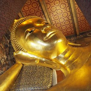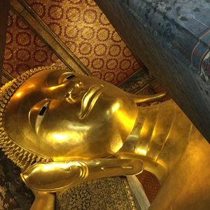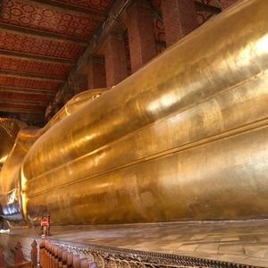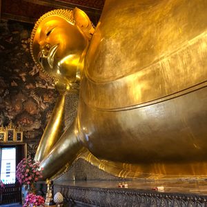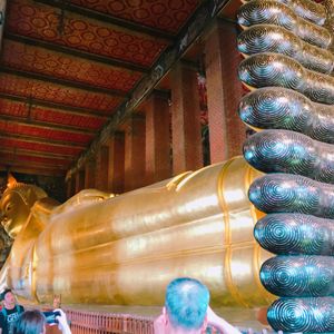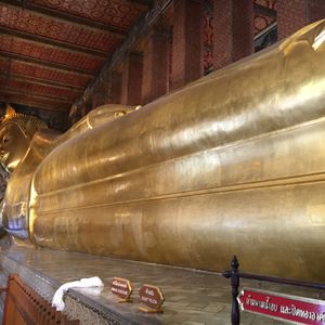ワットポーの巨大な大寝釈迦仏は迫力がありました。柱がたくさんあるので隙間から写真を撮る感じです。後ろ側に行くと108の壺があります。20バーツで硬貨を買います。硬貨の枚数がピッタリになるのかは運次第みたいです笑