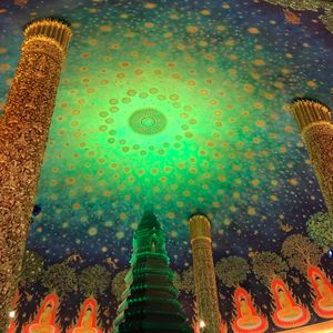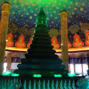 バンコク観光の3日目、朝の7時にツアーガイドさんが迎えに来て頂き、3大寺院+今回初めてのワットパクナムを観に、大型バンに7名が乗り込み、いざ出発です、日曜日ということで道は非常に空いていて、順調に一つ目のワットパクナム寺院に到着、正面の黄金の仏像は修理中で肩から上しか見えないが、目的は4階の仏塔で、緑色に輝く神秘的な仏塔は写真で見るより感動的なもので、一見の価値が有りです、その後の王宮・ワットアルン・ワットポーは、以前に4度程の観光をしているので程々に見て回りました、昼食はチャオプラヤ川の直ぐ横にある料理店で、ザ・デッキは初めてで、事前にチョイスしたタイ料理を初め、特に追加注文の肉料理・デザート類がとても美味しかったです。今回、初めてのワットパクナム、ザ・デッキは最高でした、是非とも皆さんに推薦が出来るツアーの一つと思います。
