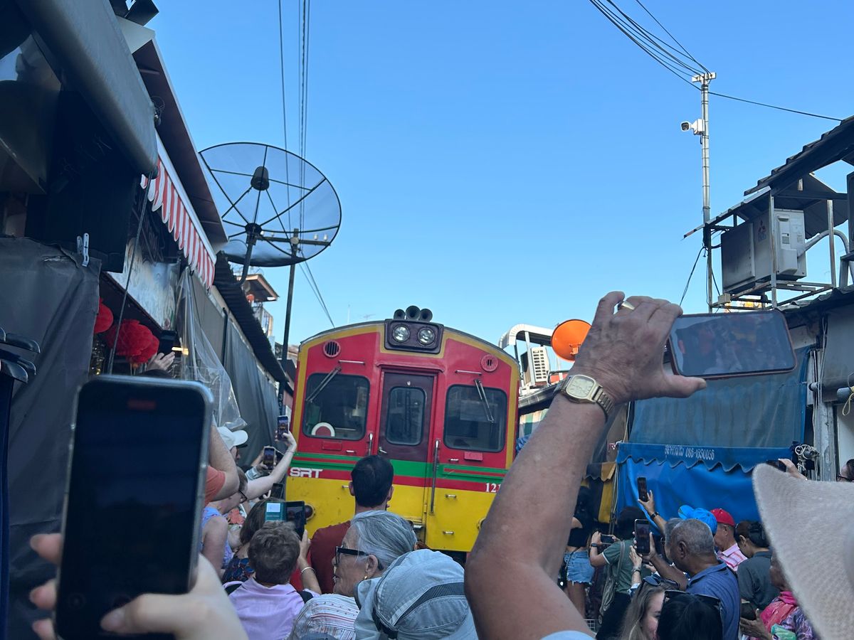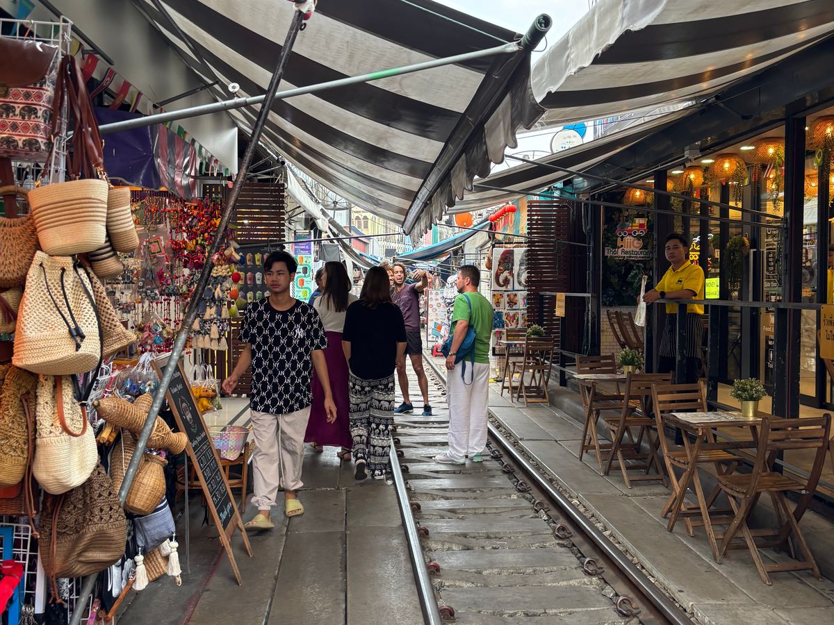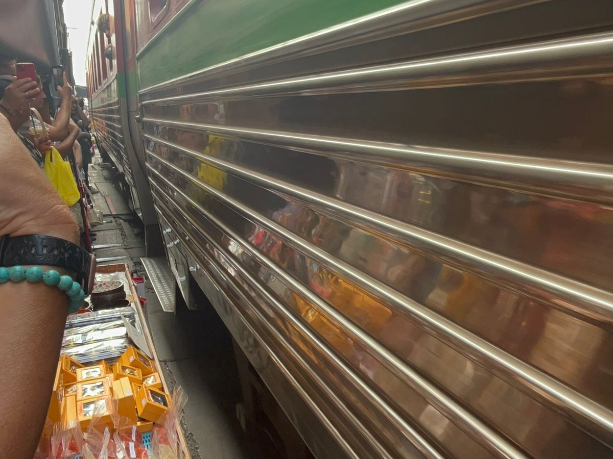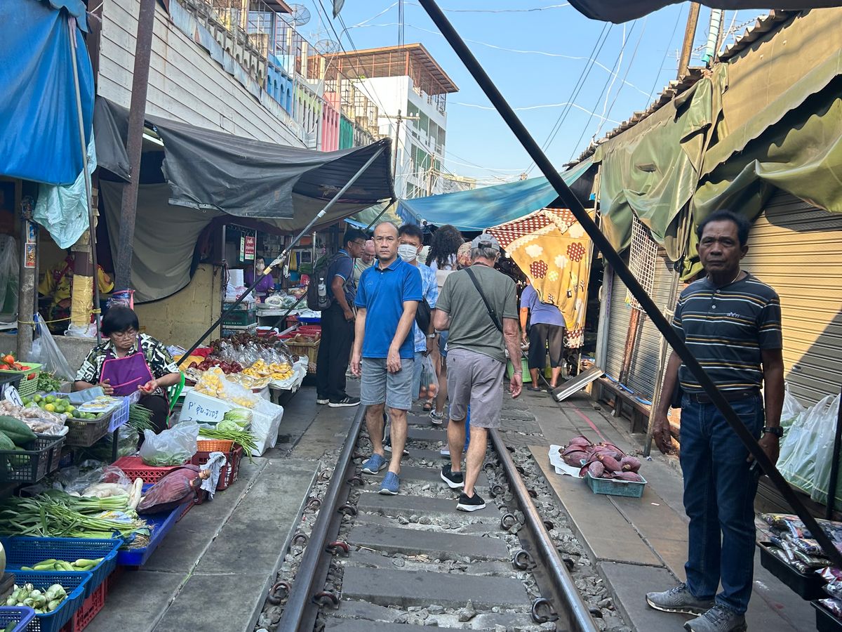 メークローン鉄道は生もの(魚や肉)が売られている場所がありにおいがかなりきついです。鉄道がくる時間をガイドさんが教えてくれるため、私たちは直前まで線路沿いのカフェで待機し良い場所で見ることができました。