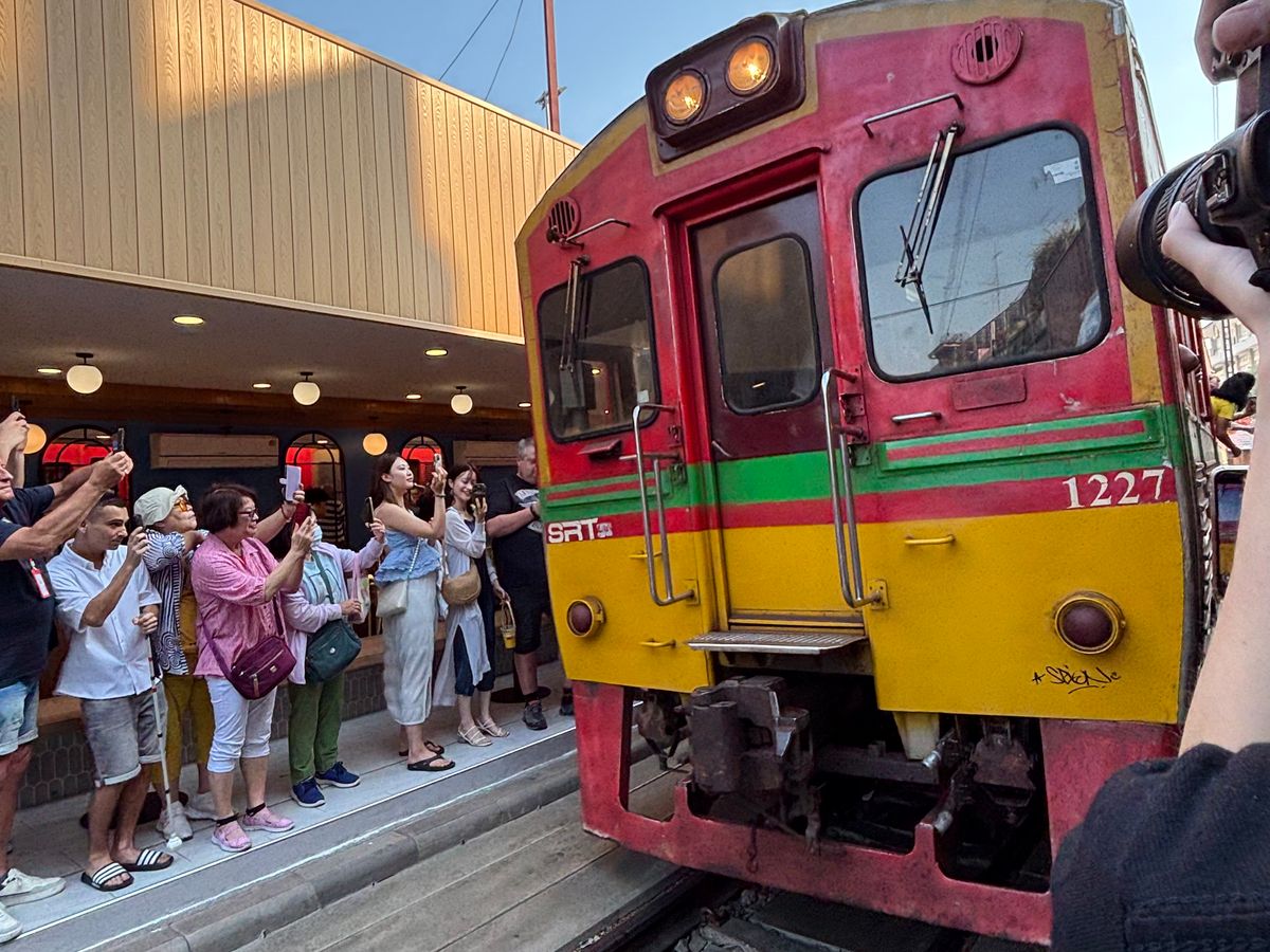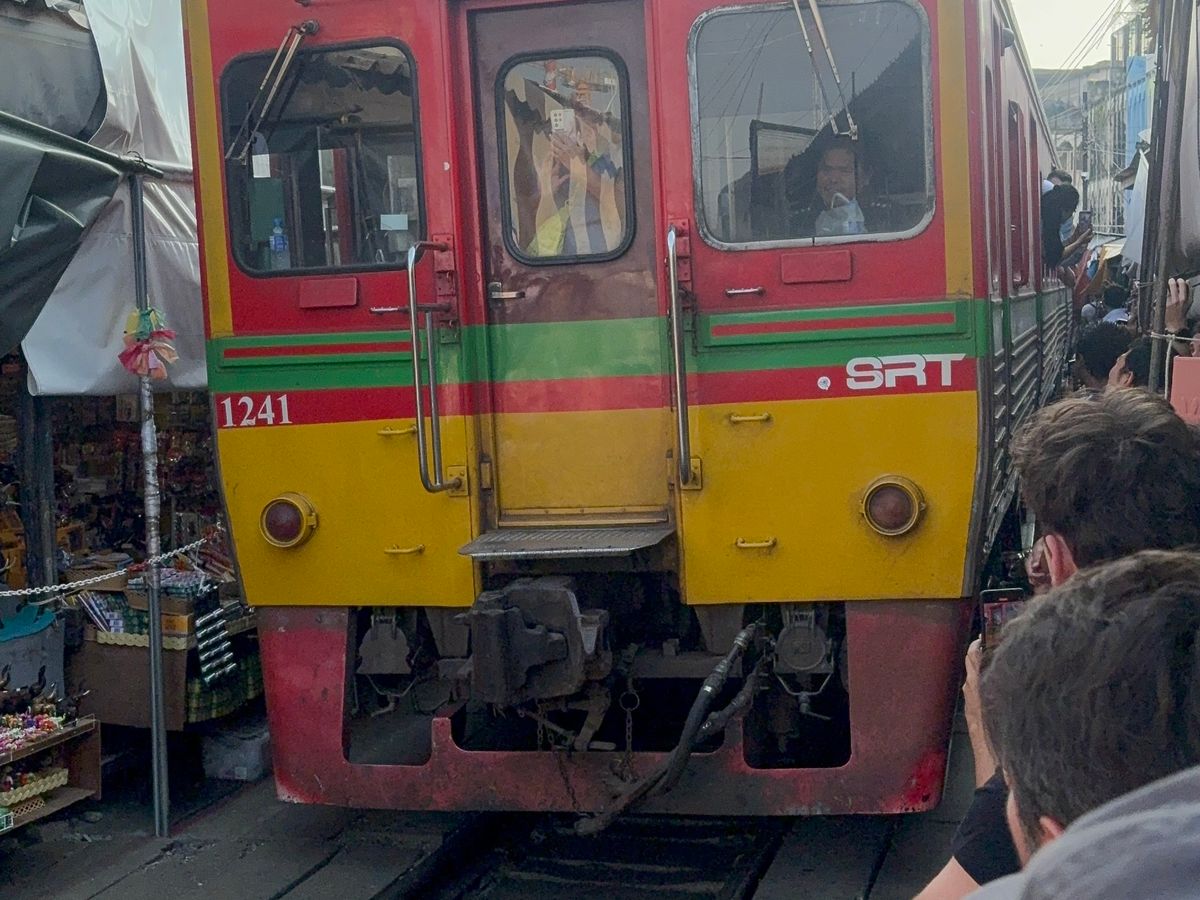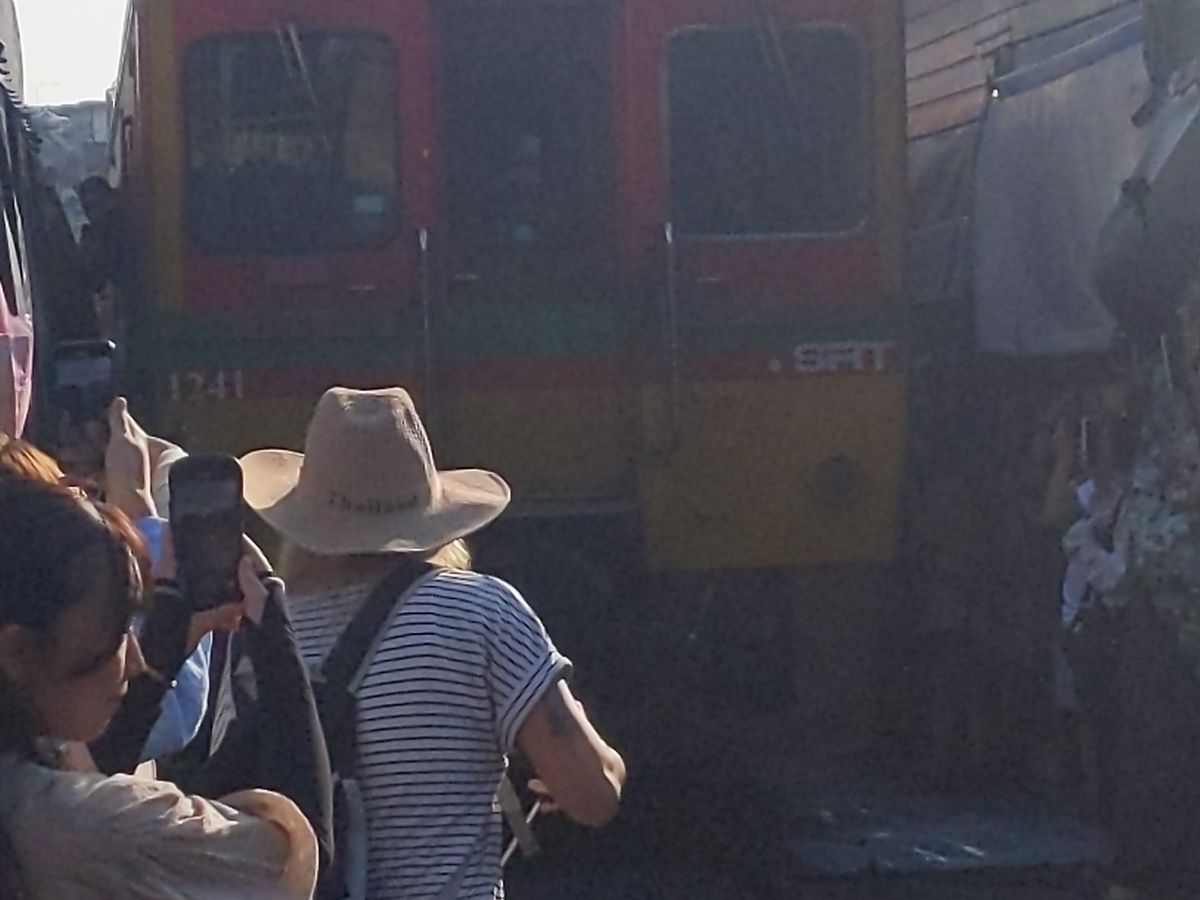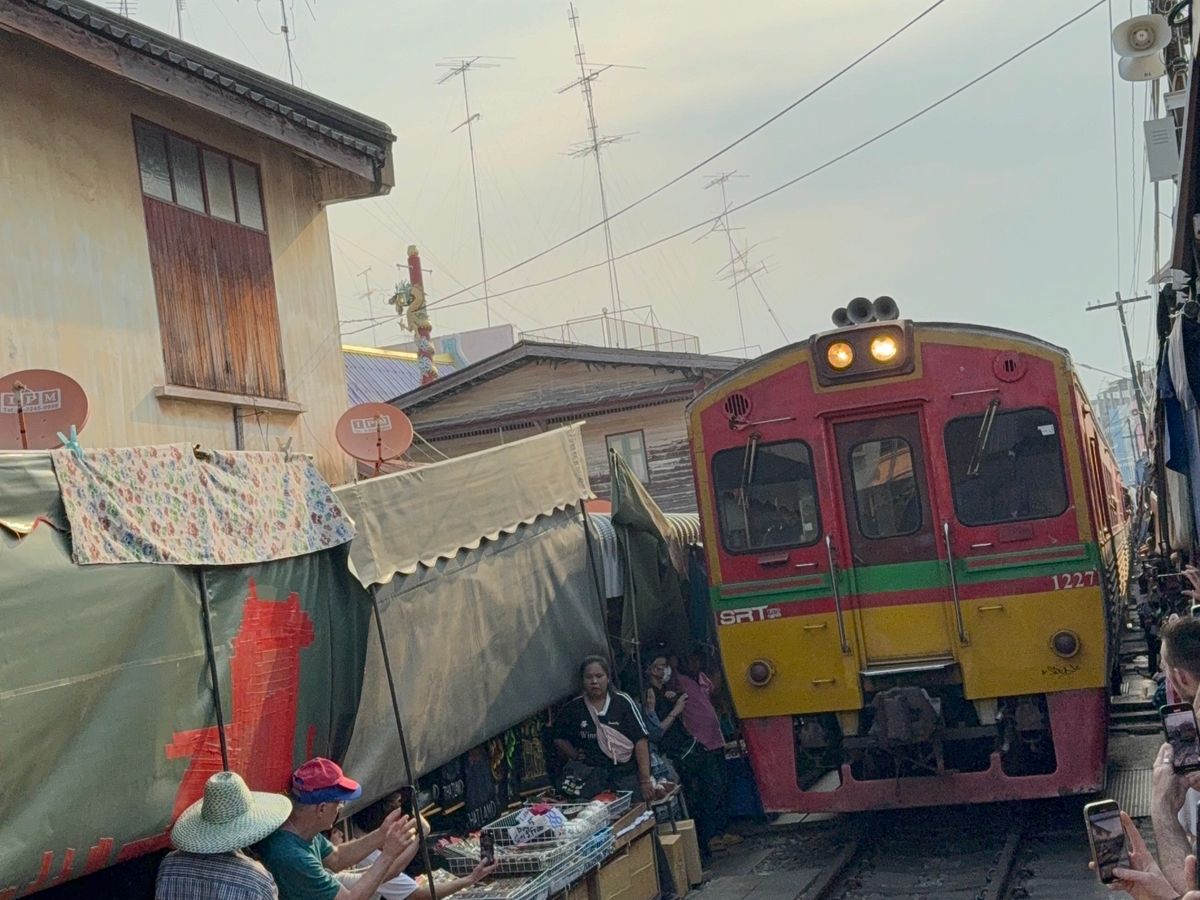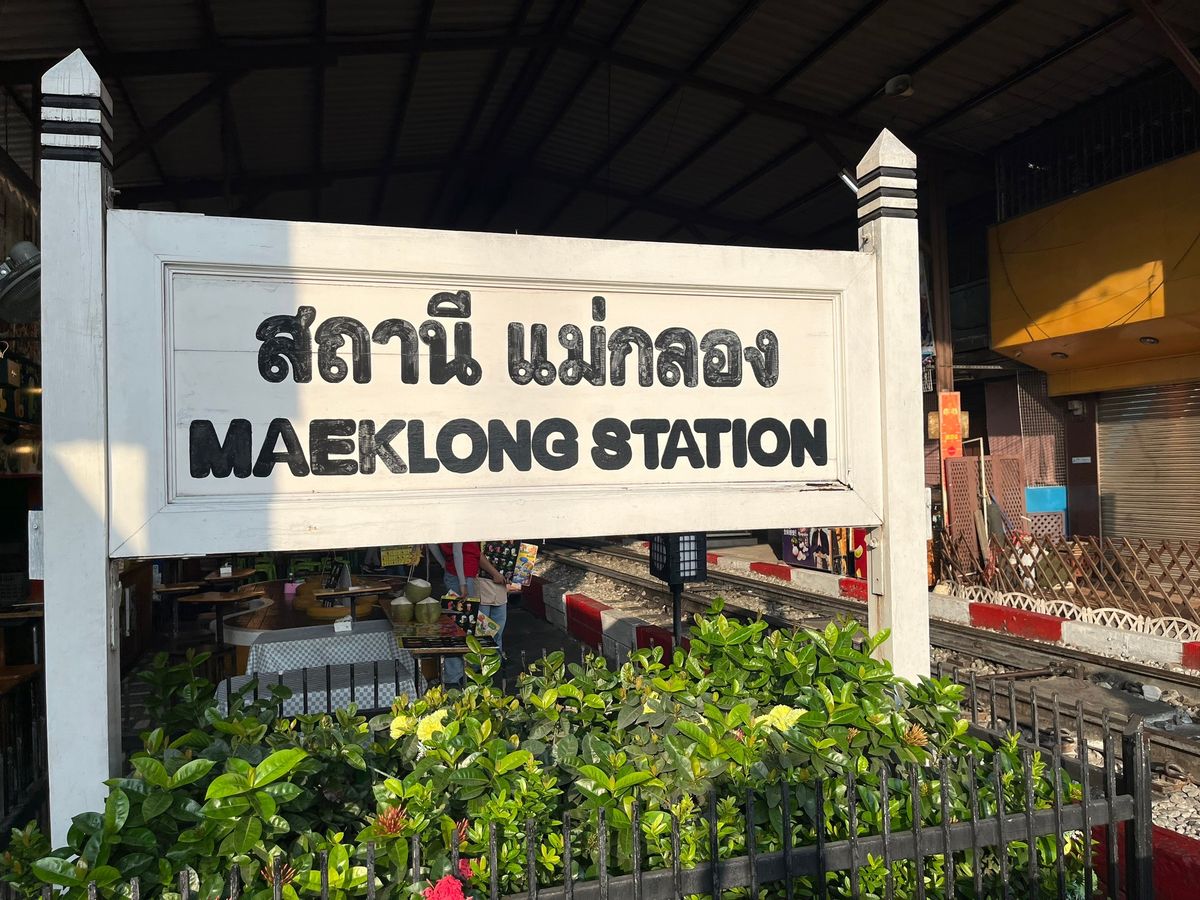 メークローン鉄道は生もの(魚や肉)が売られている場所がありにおいがかなりきついです。鉄道がくる時間をガイドさんが教えてくれるため、私たちは直前まで線路沿いのカフェで待機し良い場所で見ることができました。