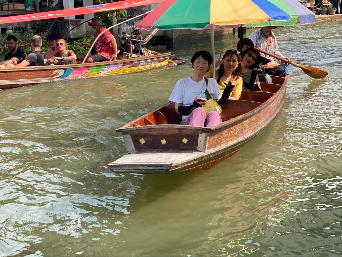 参加する1週間前から主人の急病で歩くのが大変な状態でしたが、添乗員のポンさんとドライバーさんに親切にしていただき無事にツアーを楽しむことが出来ました。同行の皆様もありがとうございました。ツアーですが、メークロン市場は観光客がたくさん溢れていましたが、駅のすぐ脇にある食堂で座ってマンゴースムージーやパッタンを食べながら直前まで過ごせました。ポンさんからは抹茶ういろうのようなおやつをいただきました。美味しかったです。水上マーケットも船のスピードがすごくて興奮しました。主人の足腰が持たずマーケットでは下船してコーヒーショップでコーヒーを飲んで皆さんの帰りを待ってました。これも思いがけず楽しかったです。象乗りも初めての体験で楽しかったのですが、途中からゾウさんの気まぐれで言うことを聞かなくなり、少し怖かったです。