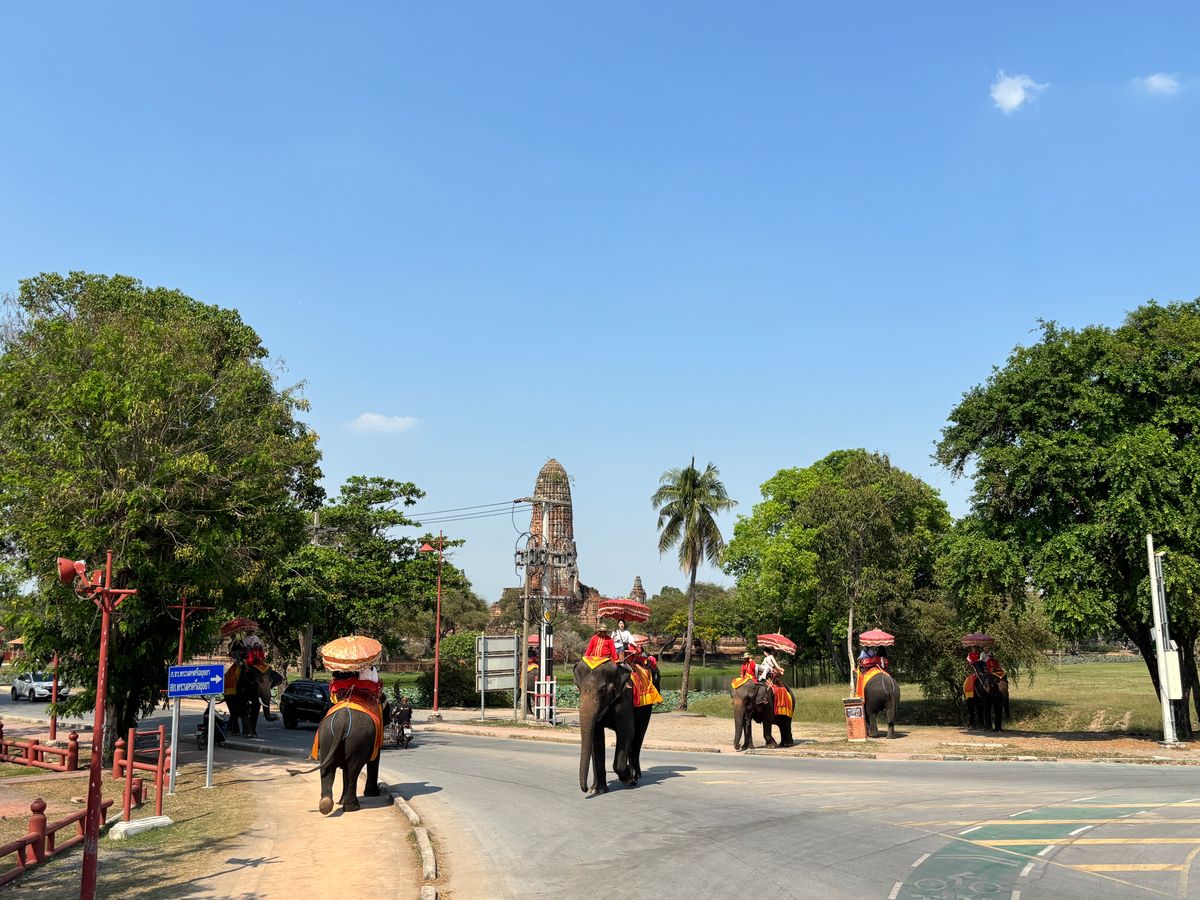 アユタヤへ向かい、遺跡巡りをして、最後にゾウに乗り、19:00頃にバンコクの駅で解散でした。