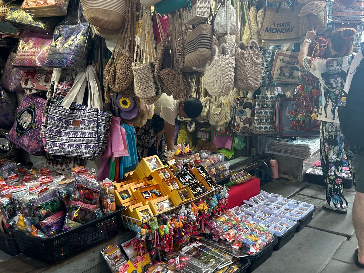 水上マーケット:ボードに乗って買い物するなら一人当たり200バーツ追加で支払いました。買い物はすごく楽しかったですが、割高なので注意、のちに行くメークロン市場のほうが安いです。地上にお店もありそちらでも買い物できました。