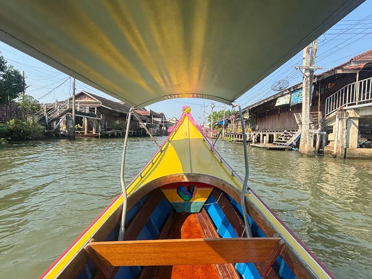 水上マーケットはメチャ速いモーターボートで中心まで行く、この後有料の手漕ぎボートに乗るかは自由だが、落ち着いて観れるし涼しいのでぜひ乗った方が良いです。