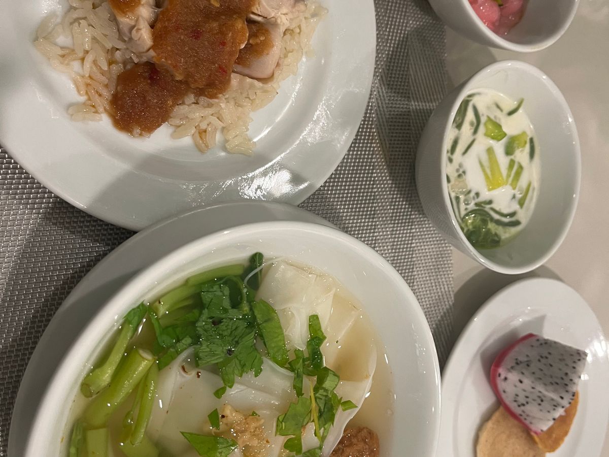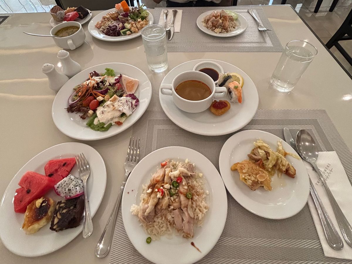何でも、カオマンガイが有名だそう。その場でホテルの方が目の前で盛り付けてくれました。生姜の効いた味噌ダレに、柔らかな蒸し鳥がとても合っていて美味しかったです!!フォーも春雨と太麺を選べて、これもホテルの方が目の前で作ってくれました。カレーも美味しかったようです。デザートもケーキから、タイのポピュラーなスイーツまで何でもあって思ったより充実した時間を過ごせました^_^ 日本人ツアー客がとても多くて、ここは日本か?!という錯覚に陥りました。