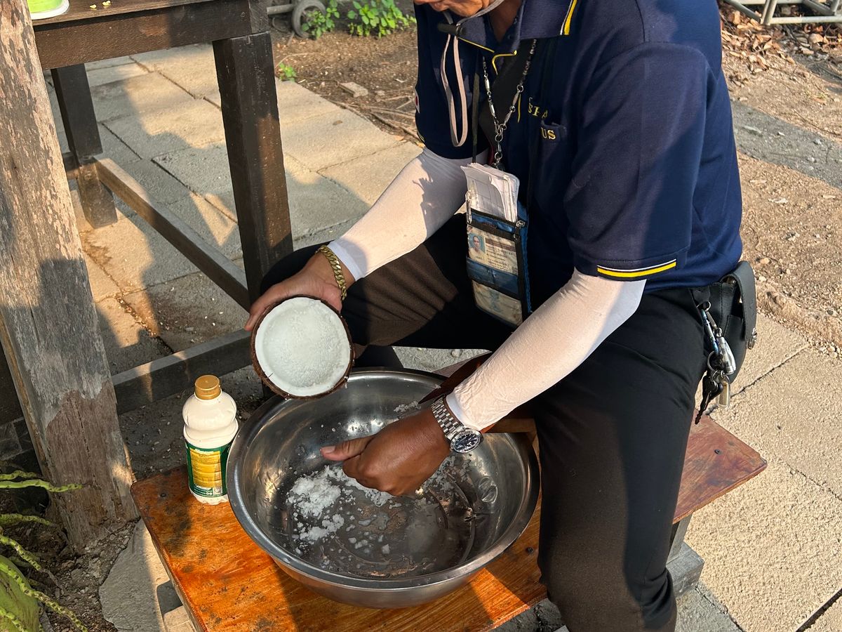 お手洗い休憩兼、ココナッツシュガーの作り方を学べる野外のココナッツファームに行きました。ココナッツシュガーは、ココナッツのサヤに包まれたお花から作られると知って驚きました!