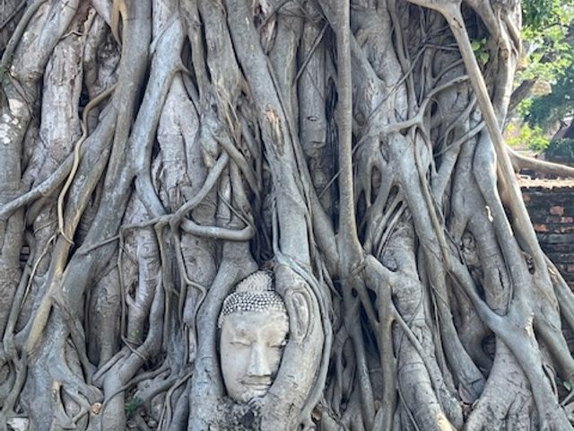 午後は刺すような日差しが強く蒸し暑くて東南アジアの乾季でもこんに暑いのか?!と思うほど、散策になかなか気力がいりましたが、涼しい車の中でお水もいただけて感謝。念願の木の根っこに包まれた仏像の頭部を拝むことができて感動しました!ただ、この周りは観光客でごった返していて、写真の撮り合いが繰り広げられていました笑。