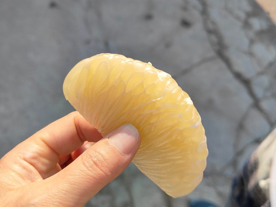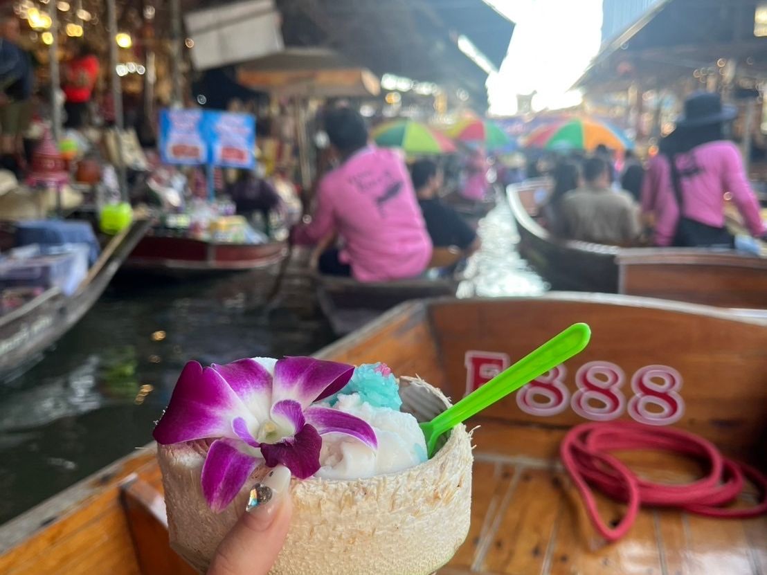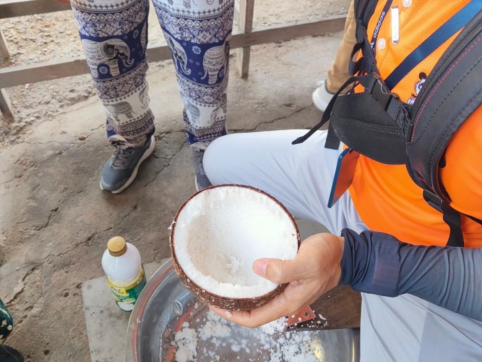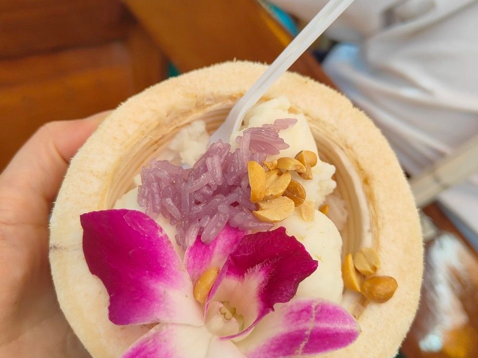 ここでガイドさんの勧めでココナッツジュースを飲み、飲んだ後お店の人に半分に割ってもらい、中のトロトロの実を食べる体験がタイらしくて楽しかったです!美味でした。
