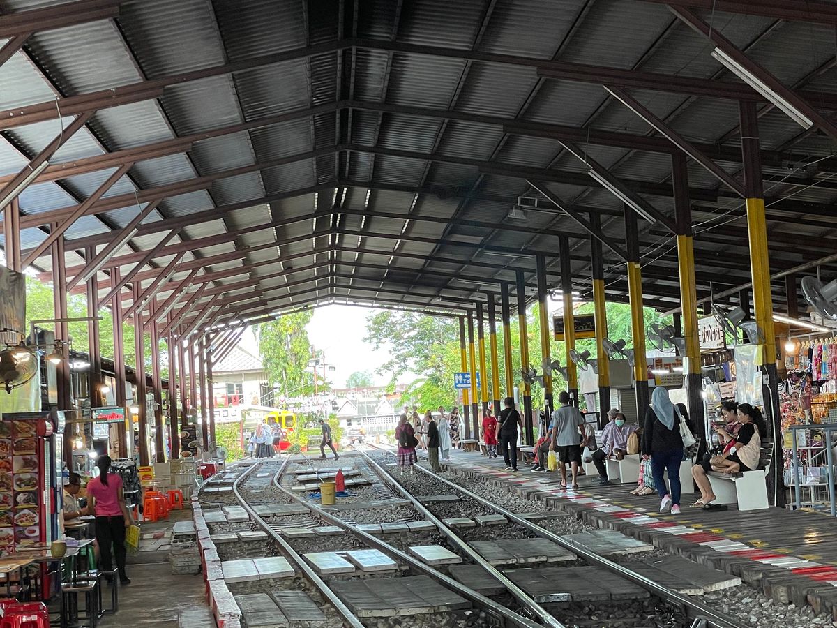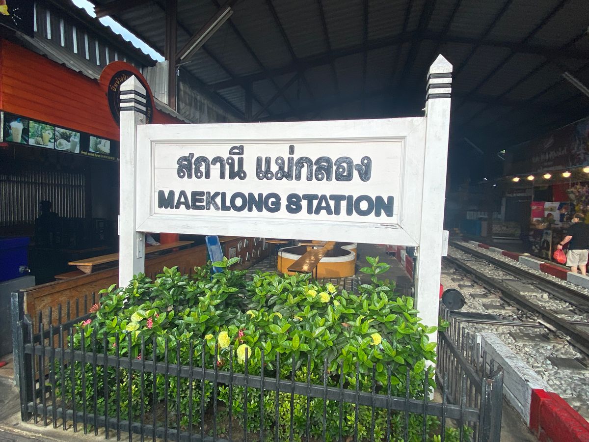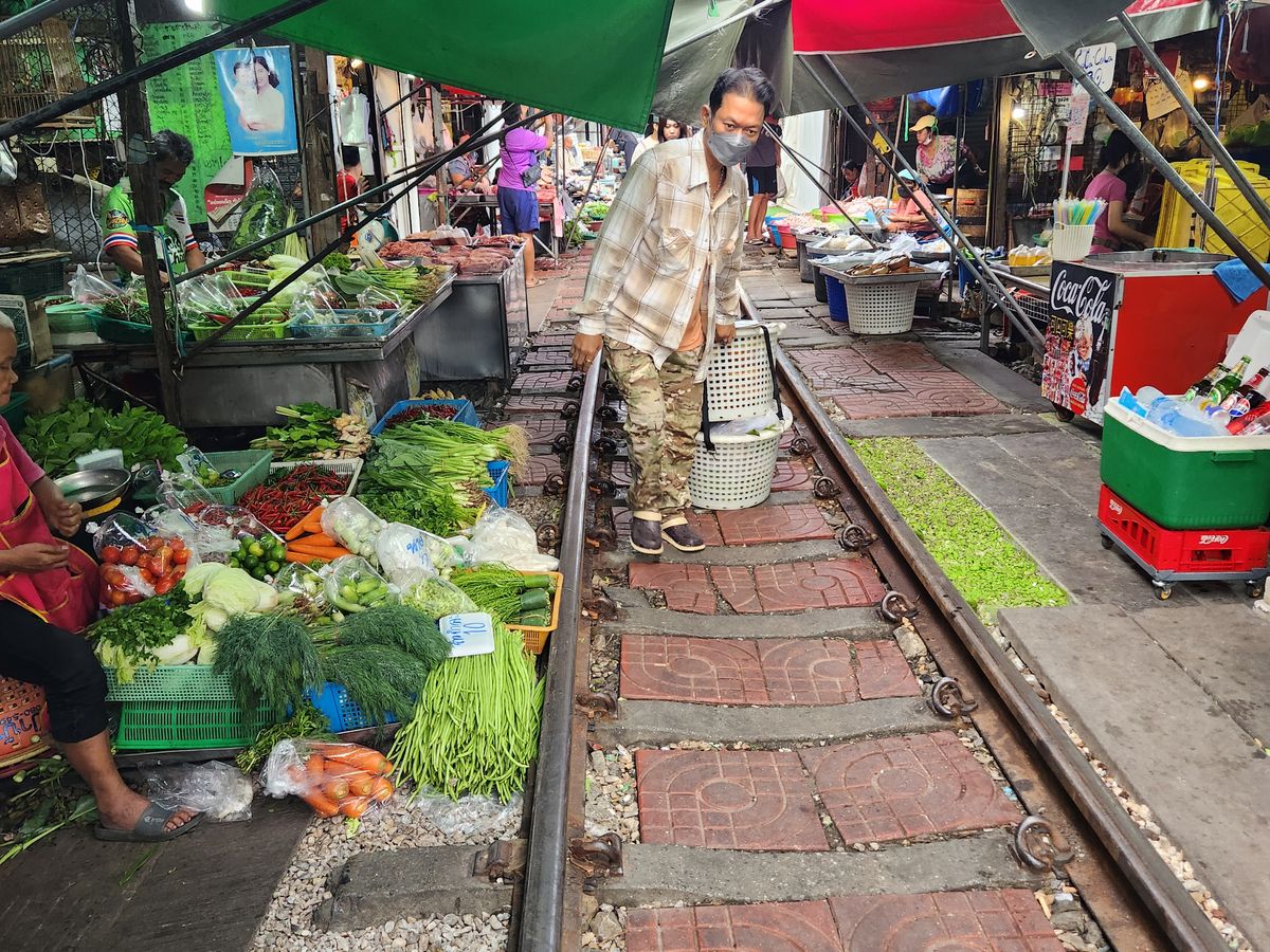 メークロン線路市場電車予定時間30分遅れの連絡入り散策,買い物ゆっくりした分電車が来た時は興奮したよ