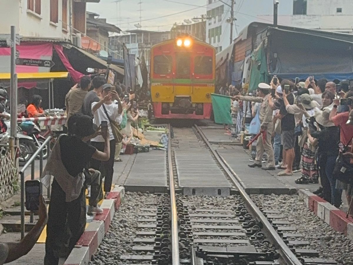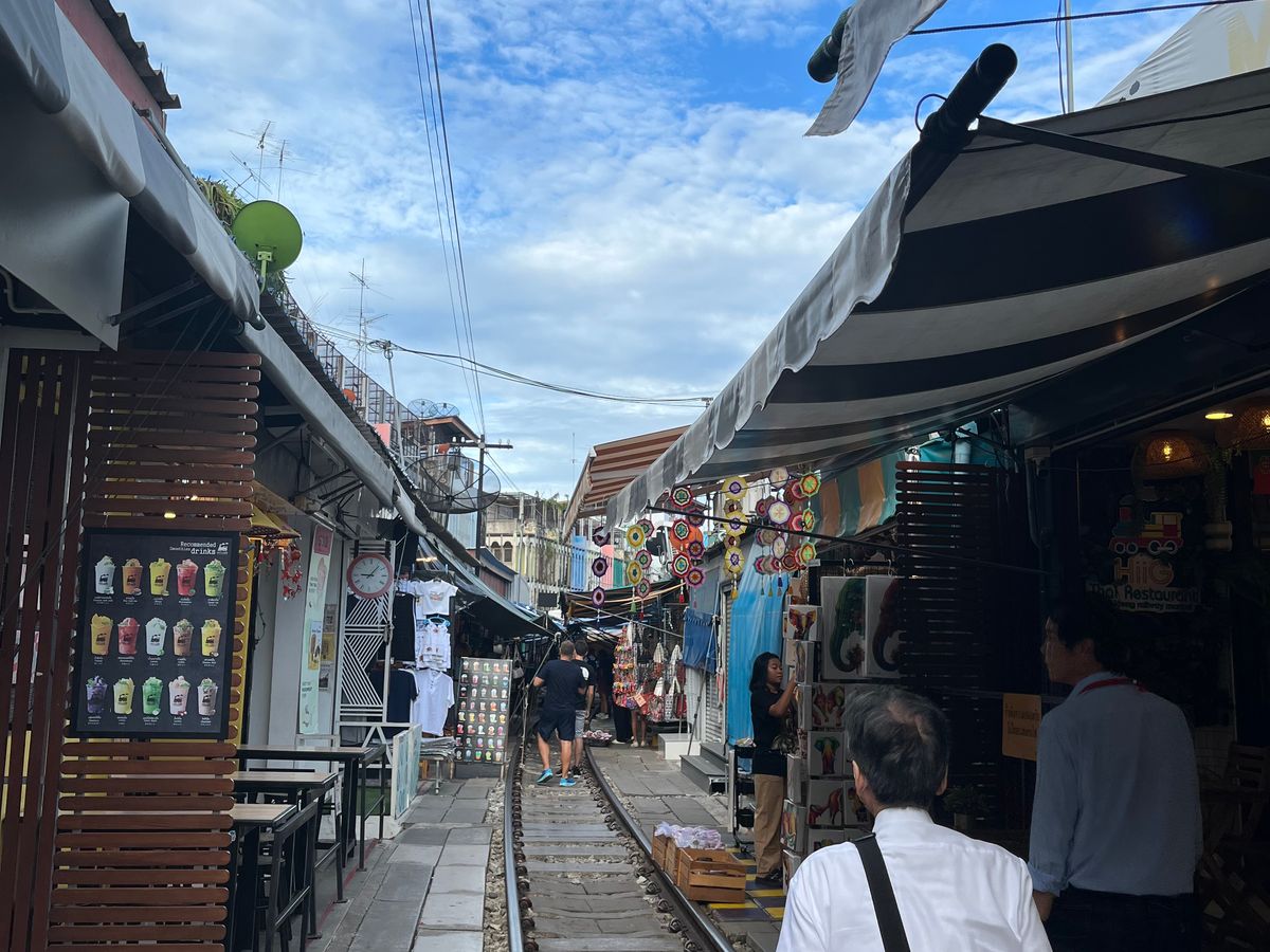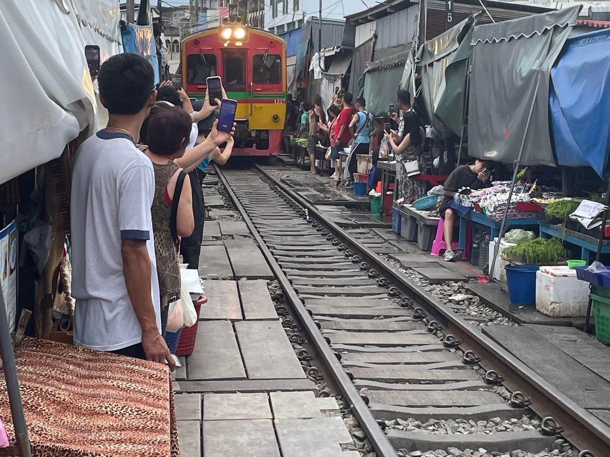 メークロン線路市場電車予定時間30分遅れの連絡入り散策,買い物ゆっくりした分電車が来た時は興奮したよ