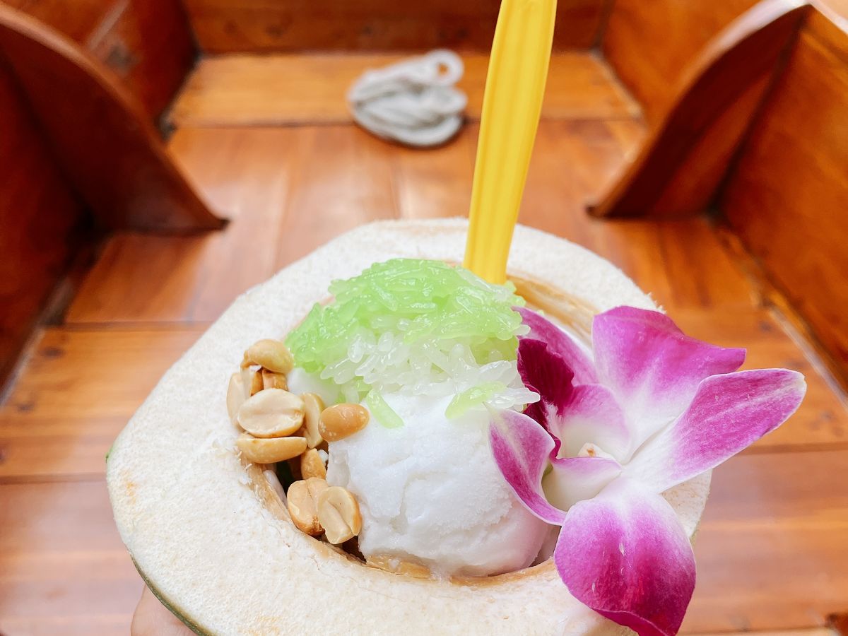 親切なポンさんが買ってくれたメークローン市場のたこ焼きとタピオカ&バナナのお餅が美味しく、水上マーケットのココナッツアイスもおすすめです。