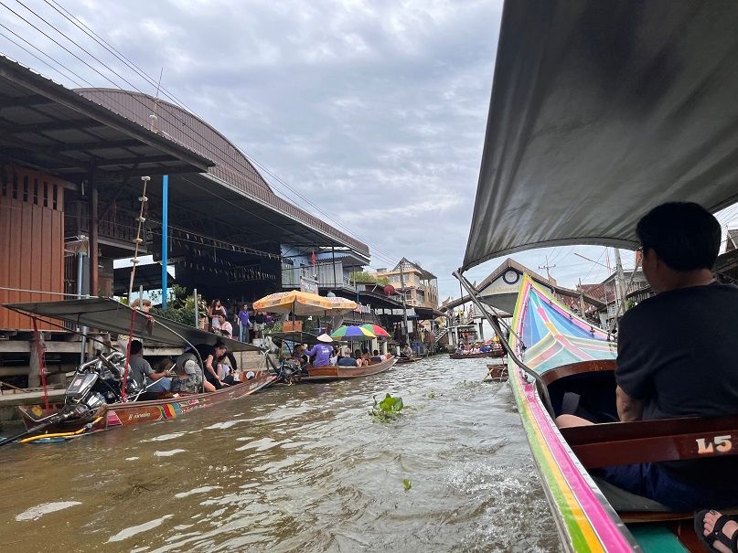 水上マーケットはモーターボートなので快適でした。メインのエリアは狭い水路にたくさんのボートが入り込み、なかなか面白い光景です。川沿いの家での生活も垣間見えて、とても興味深いです。