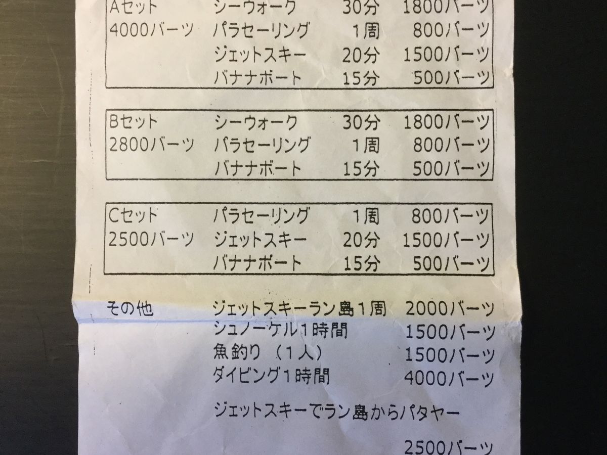 まずは車が汚かったことと、匂いが臭かったことです。古い車は仕方ないですが、車の中のゴミが袋ごと客が座る部分に置いてあったり、飲み残しの缶コーヒー等客が座る部分にそのままにしてあったり等かなり気になりました。ガイドさんがとても気さくで言葉も上手だったのですが、日本人の感覚だと雑というか、あまり気にされない方で、車中爆睡していたり、急に匂いのする食べ物を食べたり、かなり自由な感じでした。最低限の案内などは一生懸命してくれていたのですが、海だったこともあるのかかなり放置されて感じです。ご本人は明るくとても良い方だったので、日本人の感覚だと思いますが。食事は…私達は食べられませんでした。お店はかなり地元感が強く、たくさんの量を出して頂きましたが、海鮮系は生臭く、チャーハン?や焼きそば?的な比較的食べやすいものだけ少量頂きました。ただ、店員さんが野良猫を抱いて店内に入ってきて厨房らしき場所の流しの中で猫を洗いはじめた為、それ以上食べることができませんでした。お腹を壊すことはなかったので、私の気にしすぎかもしれませんが、お子さんがいたり、体調を気にされる方はおすすめできません。またパタヤからラン島へ移動する船ですが、かなり運転が荒いです。私はアトラクション感覚で楽しみましたが、一緒にいった友人は恐怖で終始無言でした。帰りは比較的穏やかだったので、こればかりは運だと思いますが。ラン島はそこそこ綺麗な海ではありますが、全体的にリゾート感覚で行くとがっかりされるかもしれません。トイレやシャワーは現地使用なので、かなり覚悟が必要です。私はシャワー使用しないつもりで行ったので良かったです。海自体は日本と違いさほどベタベタしないのであまり気にならない方はそのまま帰ってホテルでゆっくりシャワー浴びた方が気持ち的に良いかもしれないです。コインロッカーも鍵はついていますが、安心ではないので貴重品はホテルに預けてお金は最低限にした方が安心だと思います。また雨季だった為、午後スコールが来たら早く帰ります、と言われました。他に行く所もないのでそれ自体は正しい判断だと思いますが、一回目のスコールのあとかなり晴れたのにも関わらずガイドさんにもっと早く帰れるよ、と何回か言われました。私達は早く帰りたかったので助かりましたが、海を満喫されたい方はちょっとガッカリかも。帰りは何故かホテルまで送って貰えず、二駅位離れた別のホテルで下ろされました。トゥクトゥクに乗るにはちょうど良かったので、旅の醍醐味として楽しみましたが、料金を考えるとかなりがっかりだったかな、と。バンコク市内からかなりの距離を移動するので、妥当といえば妥当かもしれませんが、ある程度の覚悟が必要です。ツアー自体が駄目というよりはかなり現地よりのツアー、と考えておいた方が良いと思います!因みに私はやっていませんが、アクティビティーはそれなりの金額が必要なので、検討している方は多めに現金を持っていった方が良いです。因みに日本円だったとしてもガイドさんがタイバーツに立て替えてくれるようです。