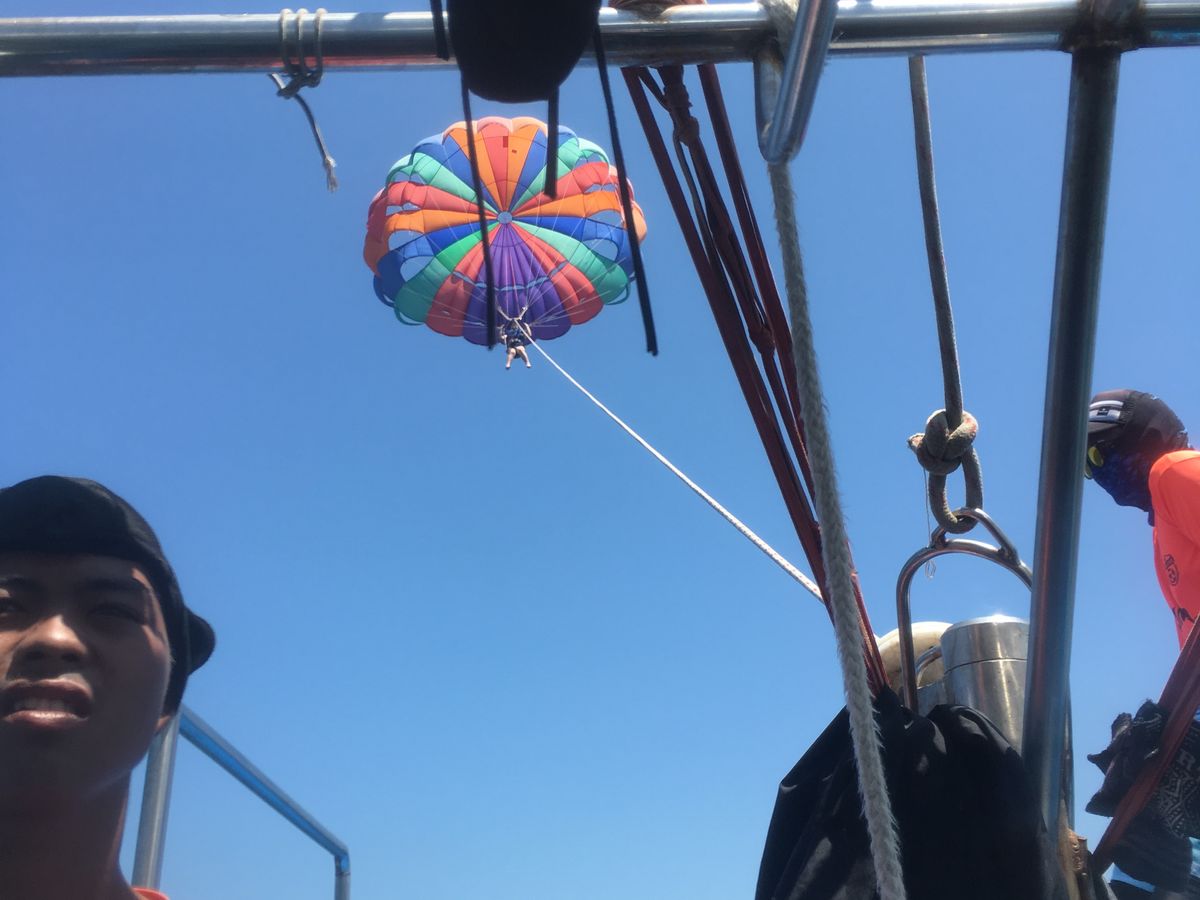 滞在時間は4時間。ゆっくり海水浴をする時間はなく、まず午前中は別料金で、バナナボートとパラセーリングをしました。