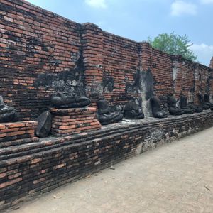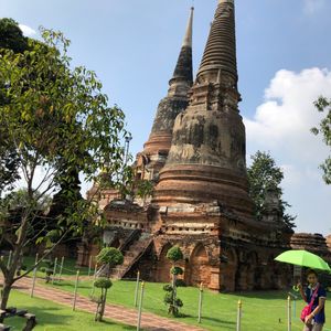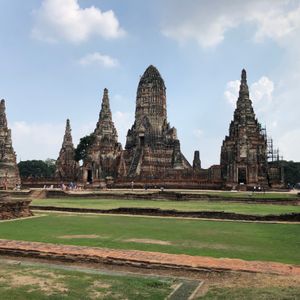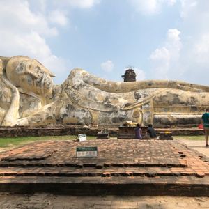 今回初めてのバンコク旅行で、絶対観たかったアユタヤ遺跡のツァーに参加しました。朝食も食べる時間もあり、半日ツァーだったので午後からもフリータイムもありと、とても充実した1日でした。ガイドさんのサラさんは優しく、丁寧に色々な歴史等説明してくれました。複雑な歴史がある世界遺産、ミャンマー軍に仏様の頭を切り落された話はとても印象に残り、戦争の悲惨さを後世に伝えているようでした。ワット・プラシーサンペットで、はアユタヤの3人の王の遺骨を納めた3本の仏塔が印象的でした。 ワット・ヤイチャイモンコンでは、高さ72メートルの仏塔があり、仏塔から下を眺めると何台もの仏様が見え素敵でした。ワット・マハタートでは、有名な木の中で眠る頭だけの仏様がいます。胴体から地面に落ちその後、木の成長とともに根元にとり込まれ、現在の姿となった仏様。もう誰にも破壊されないように木が守っているようで、自然とのコラボレーションの姿は不思議で美しい光景でした。ワット・ロカヤスタでは駐車場から30秒!車を降りたら、スグそこにどーんと横たわる全長28mもの巨大仏様は微笑みを浮かべ、まるでお昼寝でもしているかのようでした。ワット・チャイワッタナラームでは、朽ちたレンガの遺跡が連なり、空はどこまでも青く、緑と遺跡の調和はとても素敵でした。