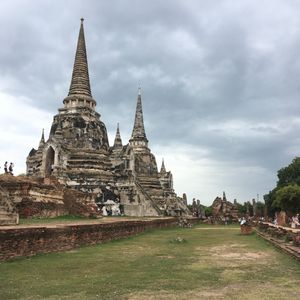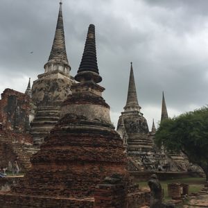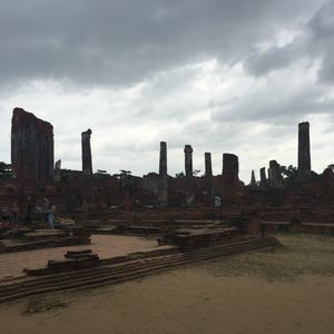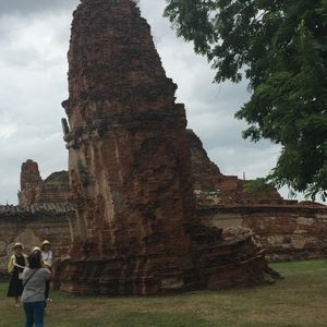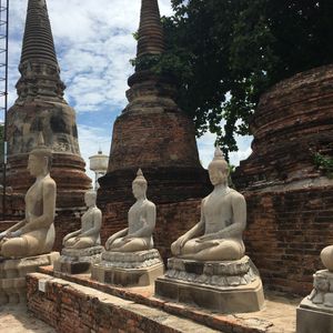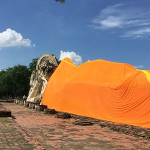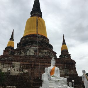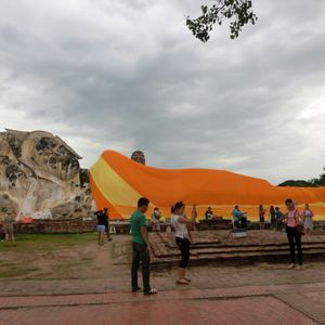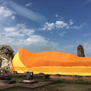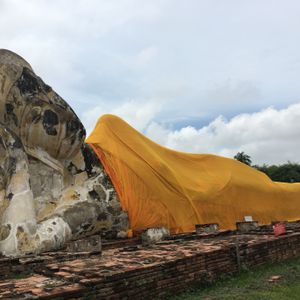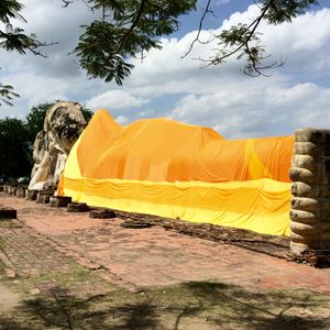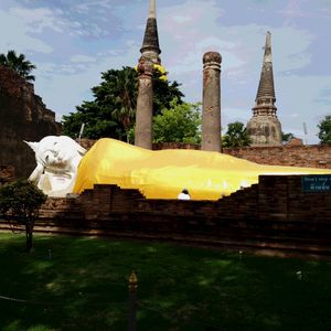 遺跡はいずれも似た感じでしたが、ワット・ヤイ・チャイ・モンコンではたくさんある仏様に袈裟を奉納することもできました。入って左の大きな白い寝釈迦仏の袈裟だと500B(商売繁盛だそうです)でしたが、登れる仏塔の周囲の仏像への奉納袈裟は40Bからあり、誰でも気軽に奉納できるようです。女性は最上段(仏像と同じ段)上ってはいけないとのことで、袈裟を着せるのに手古摺りましたが、ガイドさんが手伝ってくださったのできちんと袈裟を着せることができました。私は登りませんでしたが、仏塔の中の仏像にも奉納できるようです。現役の寺院は訪れた中ではここだけでした。後はまさに廃墟。