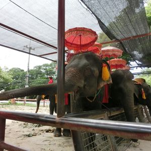 象乗りは一人400Bで二人乗り。象使いによっては帽子(ヘルメット?)の後ろにチップの金額を書いている人もいるようですが、相場は20Bとのことでした。象の背にゆったりゆられながら遺跡を見て20分。降りてから象が鼻を延ばしてくるのでそれにチップを渡しました。記念写真は160B~。時間がないのでやれませんでしたが、象におやつをあげることもできるようでした。