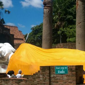 記念撮影後、まだだったので、屋台で買い出しして、昼食。ガイドさんもお隣でニコニコしながら、美味しそうにソーセージを頬張っていました。そうこうしているうちに集合時間となり、今度はワットロカヤスターへ移動。到着するやいなや、目前には目にも鮮やかな黄色の袈裟を纏って寝転ぶ全長28mの涅槃仏。お供えをお花とお香と小さな仏像に撫でつける金粉をセットで売りつけられました。それを買ったものの、お供えの作法に手間取っているとどこからともなく、優しい老婆がやってきて、作法を手取り足取り手ほどきしてくれたかと思ったら、最後に