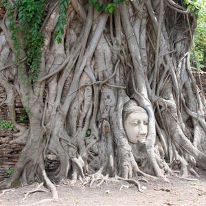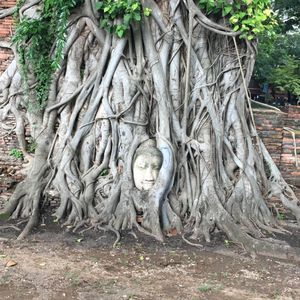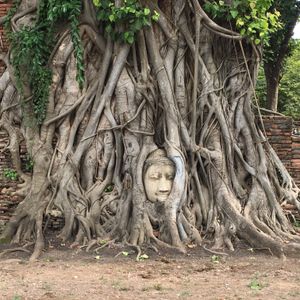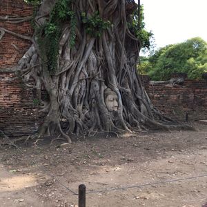 そして木に埋まっていることで有名なワットマハータート。事前にみていた写真ではもっと近くに寄れるのかなと思っていましたが、1メートルくらい離れた場所からしかみれないようになってました。