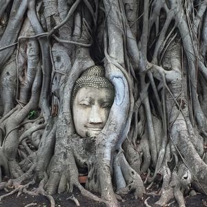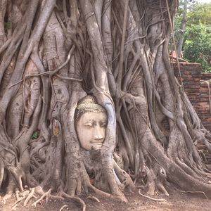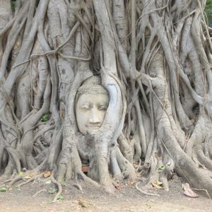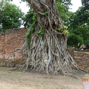 午後からのアユタヤ遺跡、菩提樹に覆われた仏像の顔の前には、赤いシートが敷いてあり座って写真が取れるようになっています。