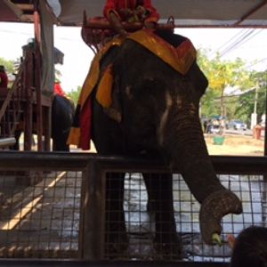 アユタヤで象に乗ったときに、同じツアーの方が後ろから象に乗って来られたのでお互いに自分のスマホで写真を撮りあっていると、象使いのお兄さんがスマホを交換してくれて、相手の象使いさんがいい距離で写真を撮ってくれました。最初乗ったときはお金を数えたりしていて愛想なかったのですが、写真撮影が終わると「ぞうさん」の歌を歌ったり陽気でした。降りるときに、初めて乗ったけど、とても楽しかった、ハッピーだ、と伝えると、とても喜んでくれて楽しいひとときになりました。
