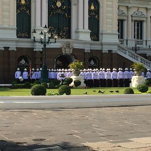 当日は、朝6時15分 hotel pick up!!は、はやい…。しかし、バンコクの朝の渋滞はひどい…。何か所かのホテルをまわり、王宮周辺に着いたのは8時20分頃。ラーマ9世の葬儀参列のためにタイ国内全土から人がやってきており、それに観光客(大量の中国人…)。ここで出会った観光客もまた、この後に続く寺院、そして遺跡までほとんどの方が行くことになるので、早くpick upしてもらって大正解。