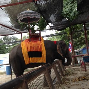 帰りには象乗り体験に連れて行って頂きました。象乗り場は2ヶ所あるとのことで、象と記念写真(有料)が撮れる所と、もう1ヶ所はホワイトタイガーがいて一緒に記念写真(有料)が撮れるとのことでしたので、ホワイトタイガーがいるところにしました。象乗り体験はぜひしたかったので400バーツで体験しました。コースは象乗り場の横に遺跡がある広場のようなところをゆっくり歩いて回ります。途中水場があり水の中に入ってスリル感もありました笑