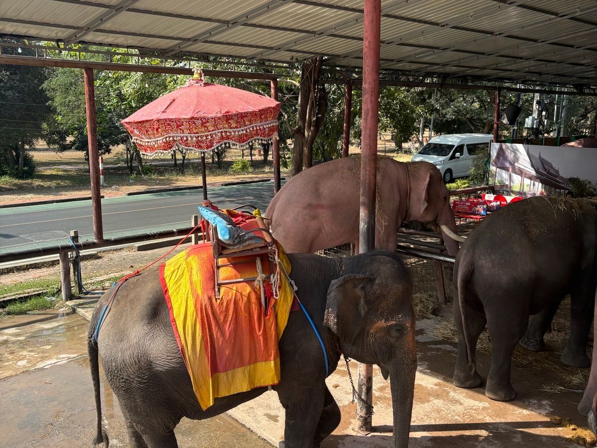 遺跡を巡るだけでなく、象乗り体験(10分300バーツ)や、タイ料理のランチも楽しめます