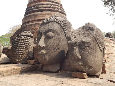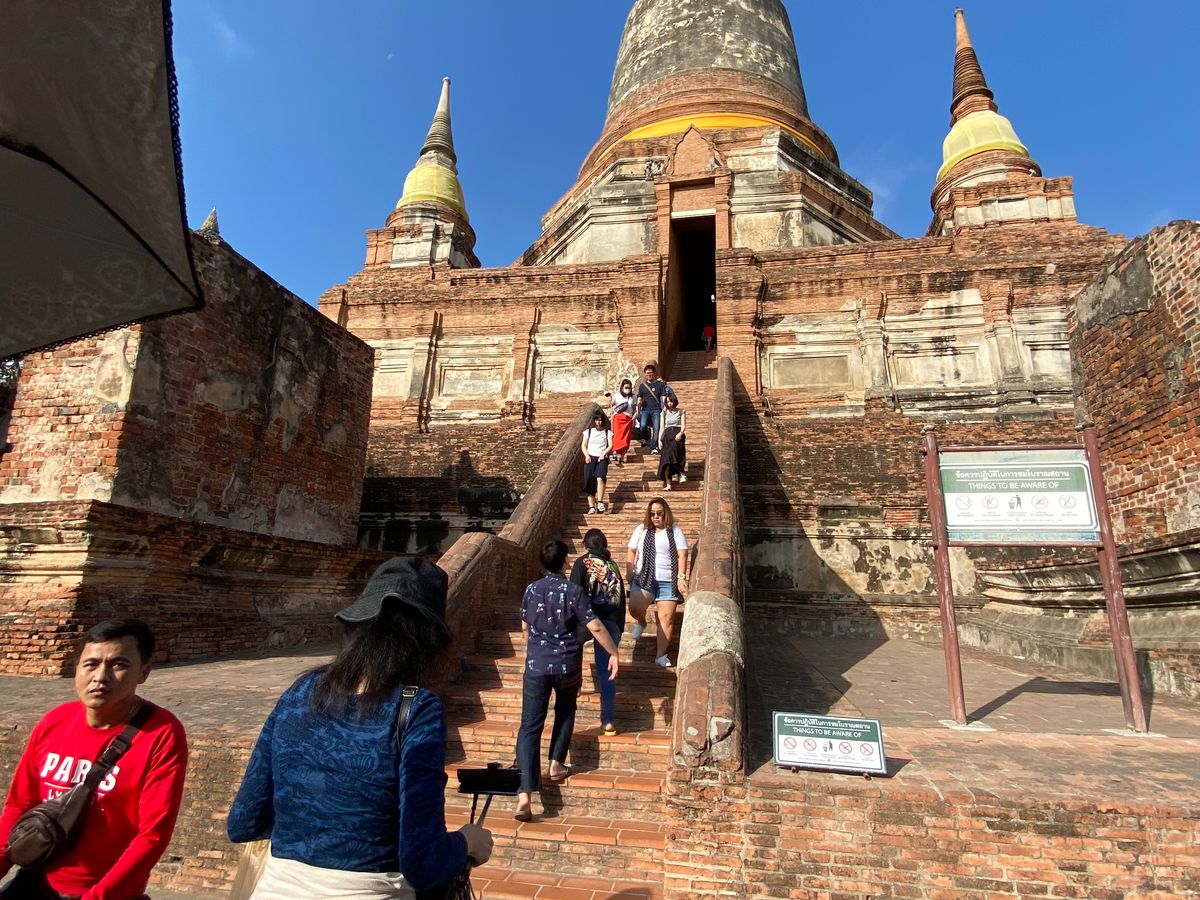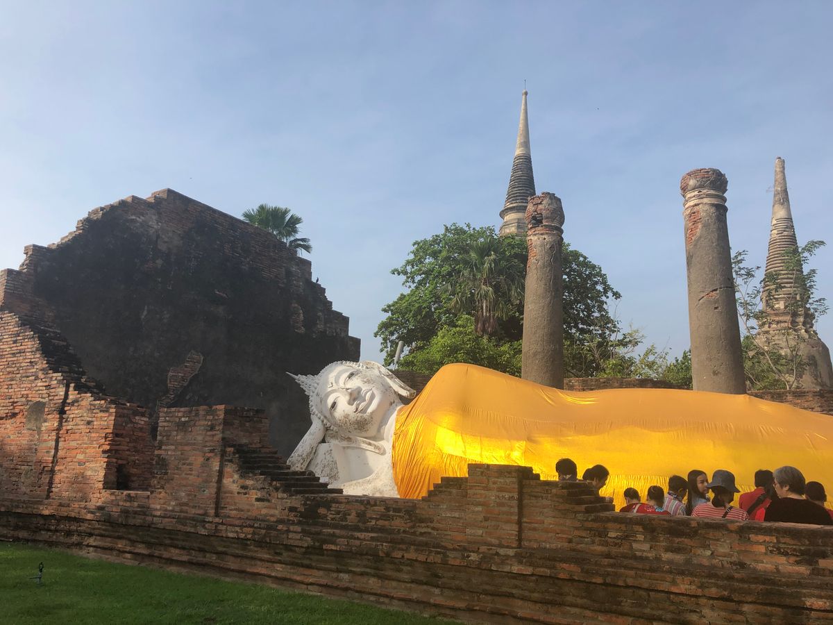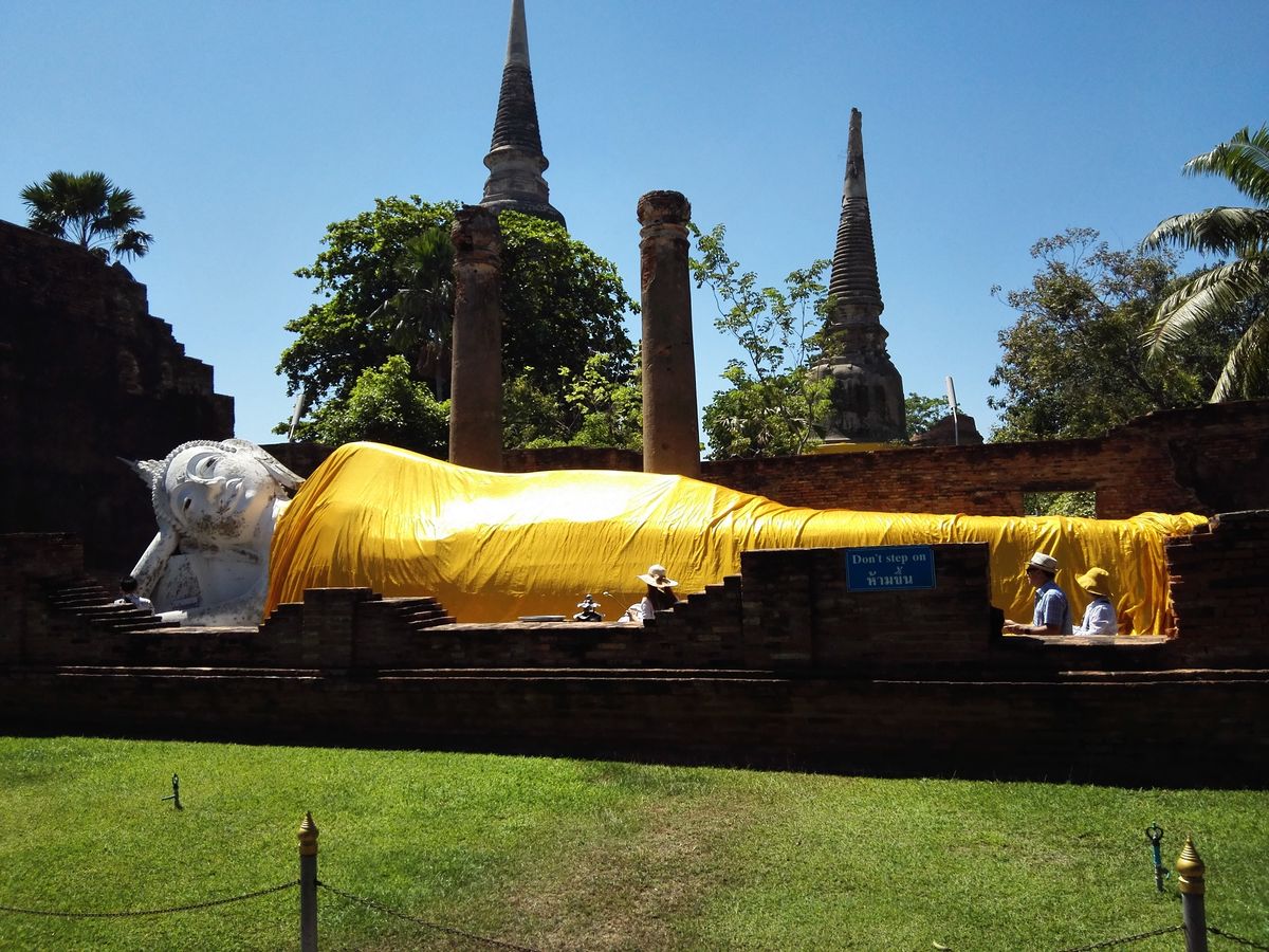 涅槃の真似をして地面に横になったり足を向けたり、遺跡の仏像跡に登る、触れるは罰当たりなのでタイに行く前にマナーとして弁えましょう。別のツアーの方が横になっていて笛を鳴らされ怒られておりました笑