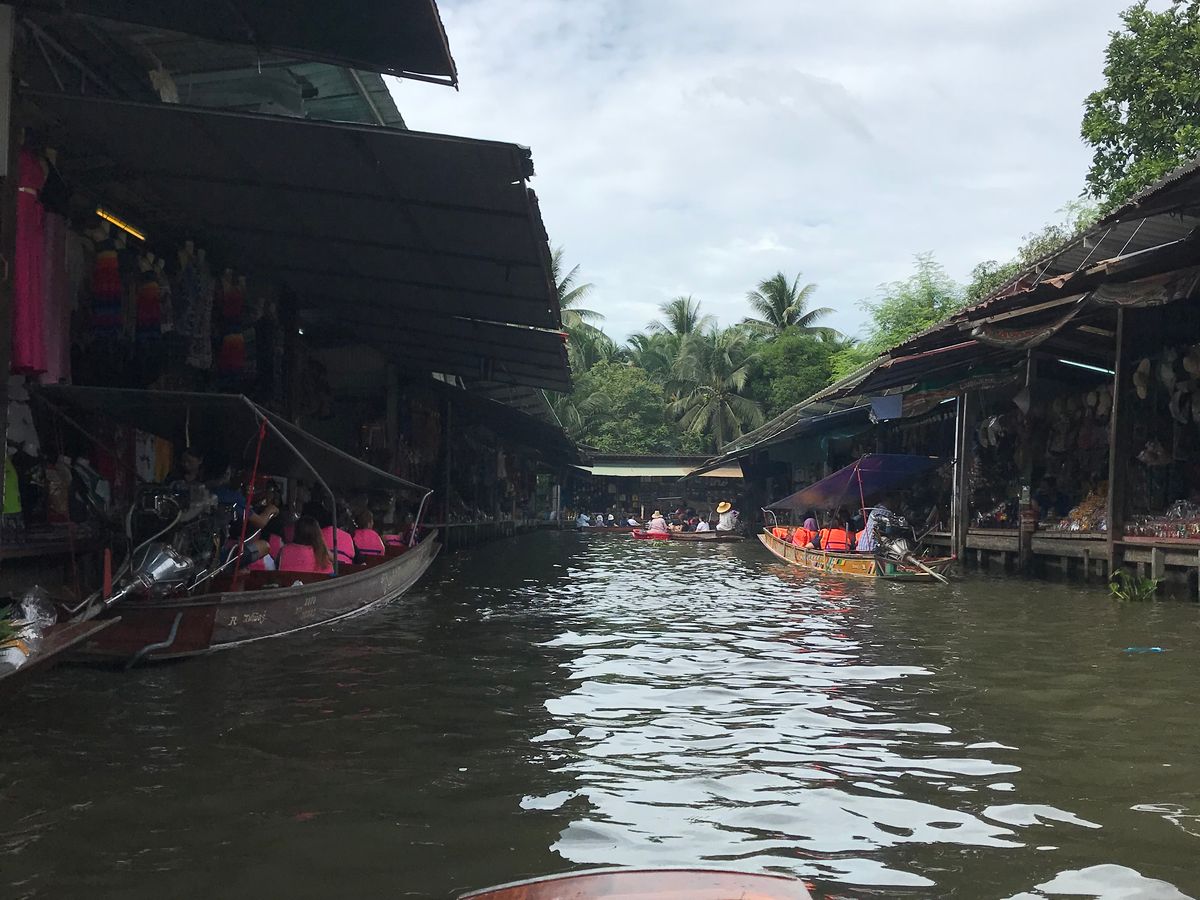 午前中は願い事が叶うと言われているピンクのガネーシャとワットパクナムのツアー、午後アユタヤツアー、2つのツアーを1日で行くようなイメージです。どちらも6人と少人数でマイクロバスでの移動でした。時期は雨季でしたが、ツアーの日はとても天気が良く晴天でした。湿度と灼熱の太陽で観光中は暑かったですが、車内は涼しいエアコンが付いており、運転手さんは私達が戻る頃にはエアコンを付けて待っていてくれていました。移動中は涼しくてとても快適でした。ツアーはまず初めに1時間半くらいかけてピンクのガネーシャまで行きました。願い事が早く叶うというガネーシャには曜日ごとに色の違うネズミにお願い事をします。ガイドさんが色を教えてくれるので、自分の生まれた曜日が何曜日だったか調べておくと良いと思いました。着いた時間が早かったためか始めはあまり観光客はいませんでした。私たちは出発してすぐにプレゼントでもらったタイパンツに着替えて、雰囲気満点。ガネーシャの前でたくさん写真を撮ることが出来ました。徐々に観光客も増えたので、着いたら始めに写真を撮って、その後にネズミにお願い事をするのが良いと思いました。その次のワットパクナムはとても神秘的で、写真ではなく実際に自分の目でみれることはとてもよかったと思いました。建物は室内で暑かったですが、バスに戻ると運転手さんから冷たいおしぼりとお水をくれました。一気に回復し、午前の部は終了。びっくりするくらい予定通りの時間に集合場所のホテルに戻り、昼食を取りました。午後の部は午前とは違うガイドさんと集合しました。そしてアユタヤに出発です。アユタヤも2時間ほどかけ移動しました。アユタヤを回る時間帯はとても暑く、それぞれの遺跡は思っていたより少しずつ離れていたため、バスの移動で良かったと思いました。途中の象乗り体験では一緒にツアーを回ったお客さんと写真を撮りあったりしました。タイで乗る象は雰囲気も味わえてオススメです。その後、また遺跡に行きました。あっという間に夕方になり、最後の遺跡を回り終わったら、また冷たいおしぼりとお水をいただきました。午前午後と2回もらえました。タイは車大国なので夕方は渋滞になるそうです。気温で疲れたのか、帰りのバスでは寝てしまい、気づいたらバンコクに戻っていました。ホテルで降りるか鉄道市場で降りるかガイドさんが確認し、私たちは鉄道市場まで連れてってもらいました。夜景の写真スポットまで案内してもらい、そこで写真を撮り、午後のガイドさんともコップンカーとお別れをしました。そのあとは夜の鉄道市場へ。屋台でタイ料理を食べたり、夜市ならではの雑貨屋さんでお買い物をし、自分たちでホテルに帰りました。