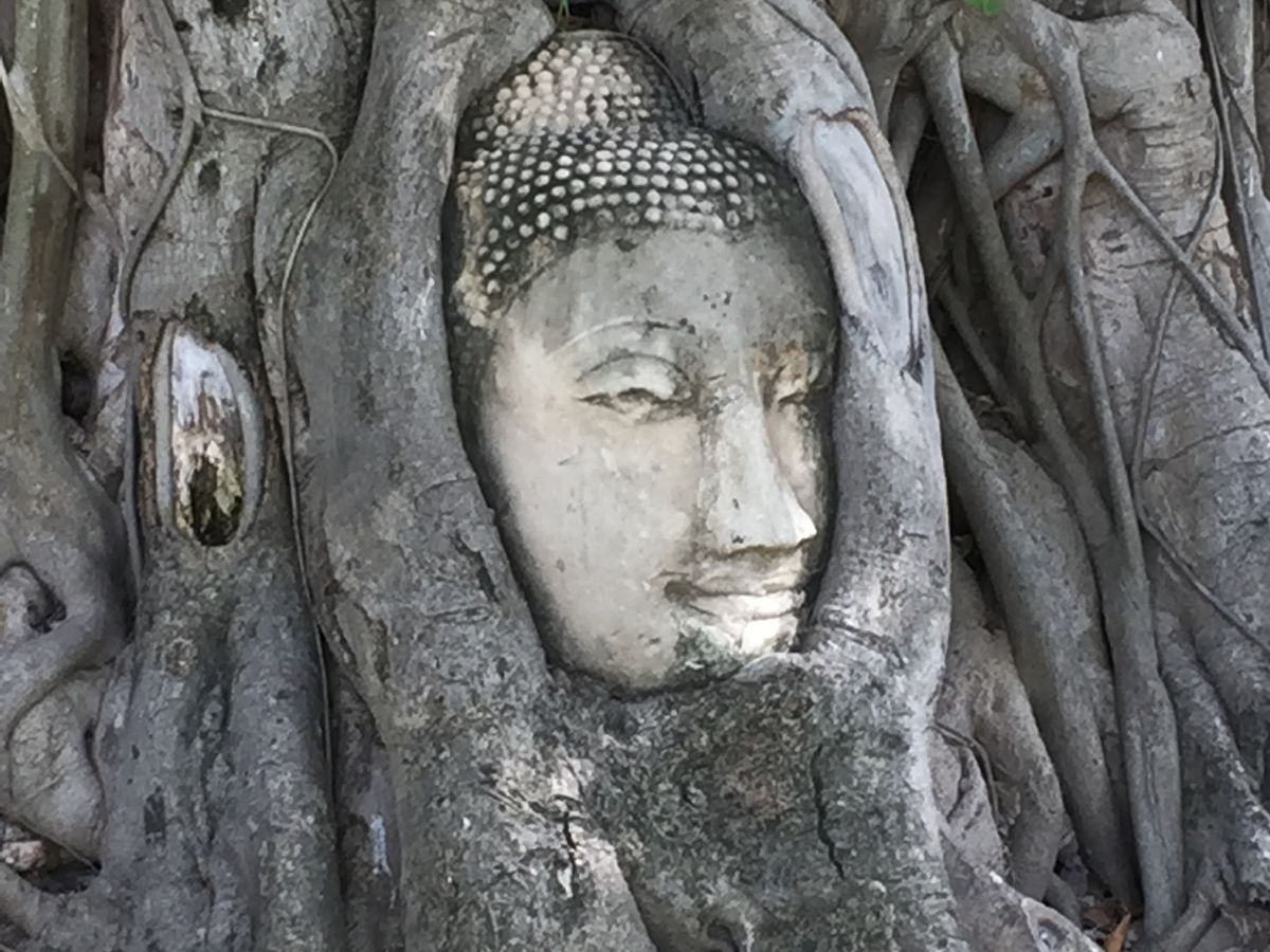 それから、アユタヤ観光!車で1時間半位、クーラーの効いた車の中でお昼寝タイムでした。お目当は何と言ってもワット・プラ・マハタート。不思議な光景です。早速、仏様のお顔より下で写真を撮ります。ガイドさんが上手に撮ってくれました。次は象乗り体験です。これはオプションですが、中々出来ない体験なのでおススメです。大人しい象さんに揺られて貴重な経験をしました。