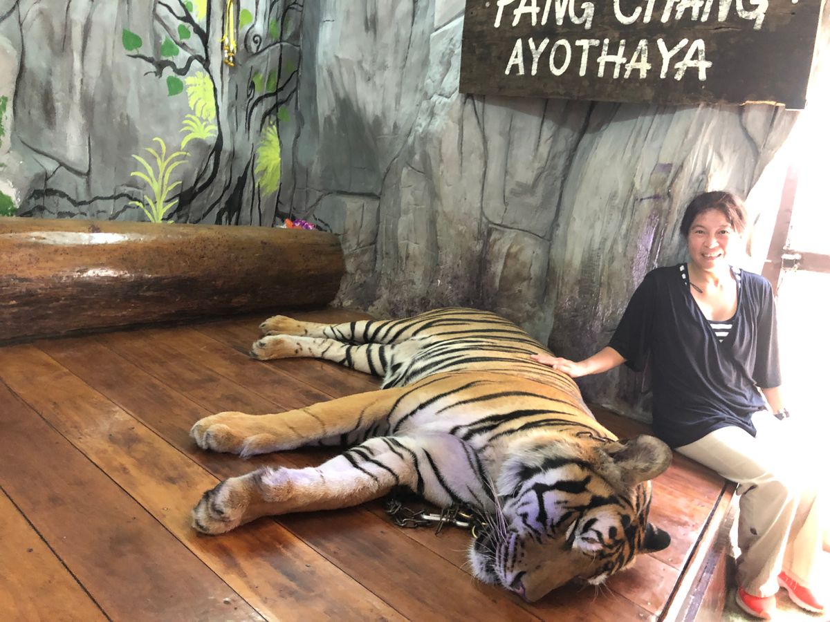 アユタヤ遺跡では午前のバンコクの王宮とは異なり質素ながらも力強い遺跡を見ることができました。像にも乗りましたが、像使いの方がアクセサリーを売ってきたから断るとチップの要求があり払うまで後ろを向いてチップとうるさかったです。チップは用意してましたが、最後に渡そうと思ってたから、あのしつこさにうんざりでした。トラとの写真は他の場所よりも安く200バーツでした。ただ虎が眠っていて手を背中に触れるだけだったのですが、満足しました。水も朝に1人もらい、昼前にハーフの水をもらいました。暑かったので冷たい水は嬉しかったです。