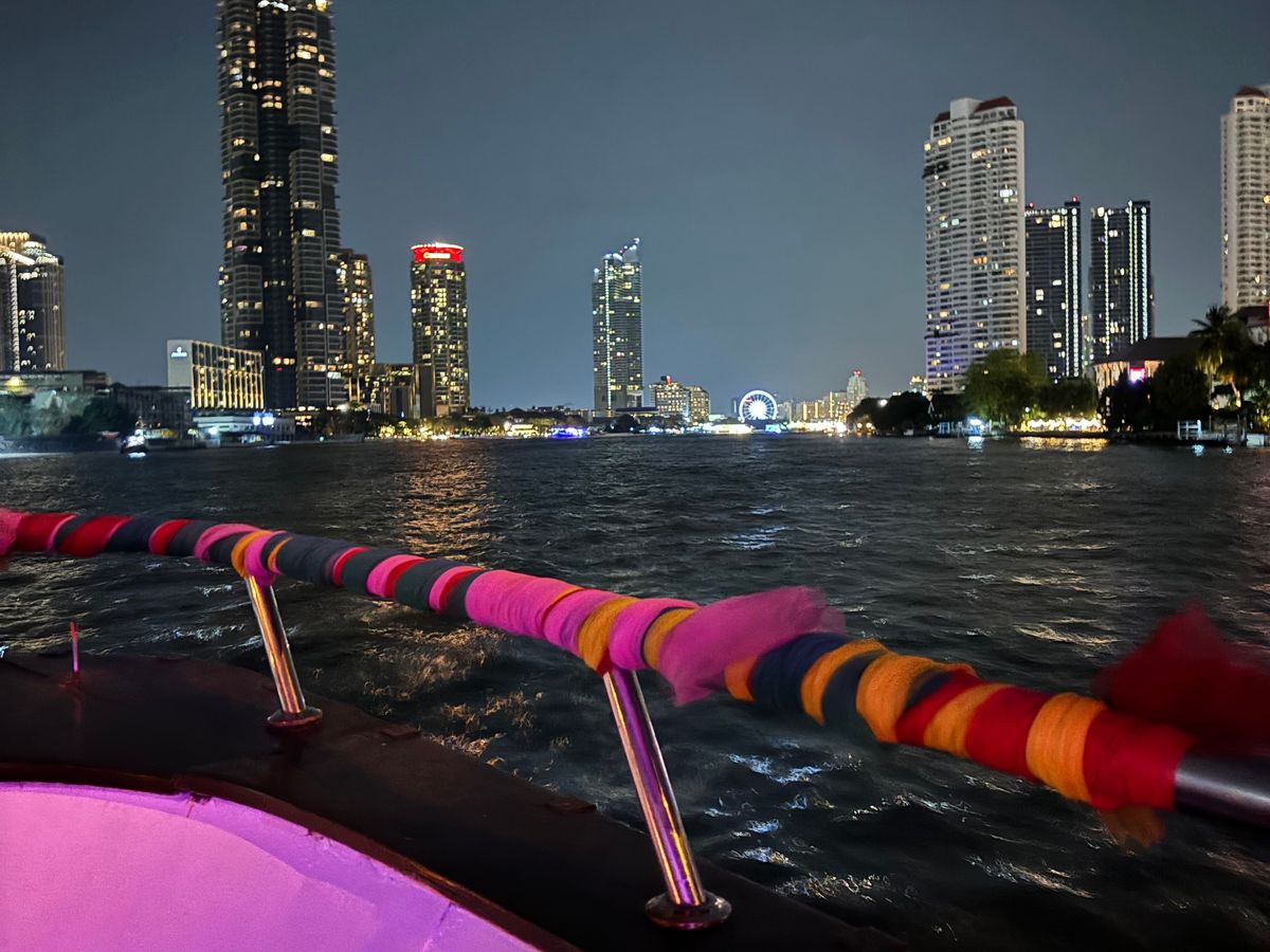 夜のディナークルーズも申し込み、参加しました。2、3時間ほど、バンコクのチャオプラヤ川の上で綺麗な夜景をたっぷり満喫できます。今回は屋外の席にしました。食事はブッフェ形式で、屋内に並ぶ料理を自分でとりに行きます。食事をしながらバンコクの風情を感じられる穏やかな時間を過ごしました。一方、客船の最上階ではアーティストが盛り上げ隊となって音楽を奏で、賑やかでした。