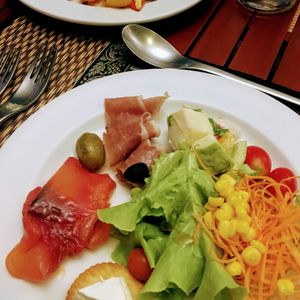 料理の種類も豊富でホテルマンの立ち居振る舞いもすばらしく、最高のおもてなしでさすが一流ホテルだと思いました。ホテル専用の渡し船のシャトルボートで行くのですが、その船の中で厚手の冷たいおしぼりが配布され、スッキリしてホテルに向かい、気持ちよく食事を楽しめました。同席の友人が少し咳き込んでいたら気を利かせたホテルマンがハニージュースを持ってきてくれ感動しました。料理はタイの郷土料理から魚介類を中心に豊富で、握り寿司や刺身もありました。とてもすべては食べきれないほど大満足なディナーでした