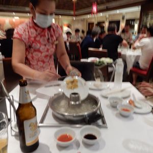 外観はとても素晴らしく、ほんとに名店と言う感じでした。店の中も大変広く丸い円卓があってゴージャス感がありました。予約してた時間に行ってすぐテーブルに案内されたのですが、ビールを注文してすぐ飲んで待っていると、料理が来るまで10分以上待たされました