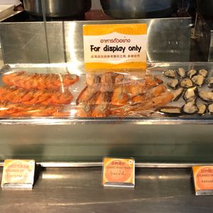 ブュッフェディナーで1人3300円くらいだから、料理内容とお店の雰囲気にはそれほど期待していなかったのですが、種類は豊富で、シーフードにはエビ、貝、がたっぷり盛り付けらていたし、最終日でタイ料理にも少々飽いたお腹にはお刺身や握り寿司は美味しかったです。行った日はサーモンのお刺身でしたが、切り身が盛り付けられているのをとってくるのではなく、ローストビーフも、刺身も、その場で切ってくれるので、気持ち良いし、みずみずしくおいしかったです。