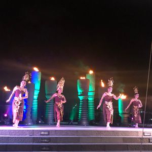 BTS降りてから船が心配でしたが、係りの人が色々声掛けしてくれてスムーズに行けました。無料なのにオシボリ付きでチョットした川下り。18時チェックインの案内で、18時より20分前に着きましたが、実際は席もリザーブされていて、19時半のショーの時間に合わせて行っても良いかも。早すぎた到着で、1回目のショーだけ見て、夜景を見ながら20時発の船で帰ってきました。船の上のショーとデイナーと迷いましたが、料理、ショーも含め満足した夜になりました。