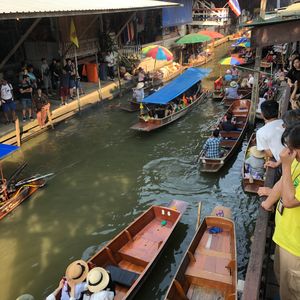 日本の川下りとは全く違う、迫力あるアトラクションといった趣のエンジンボートで水上マーケットへ向かいました。食べ物や日除けの帽子を手漕ぎボートで売っています。観光客向けの水上マーケットですが、バンコクならではのものでとても楽しめました。