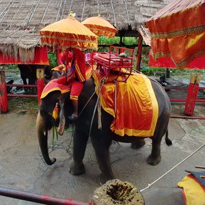 雨季だったのでアユタヤ遺跡で象に乗るときと移動中に土砂降りになり、象には少ししか乗れませんでした…ガイドさんのお話だと寺院での観光は雨が降ると少し大変なようです。車には傘が用意してあって借りることができました。晴れは晴れでかなり暑く日に焼けるそうなので、日焼け止めやタオル、車内で冷えるので上着はあったほうがよさそうです。