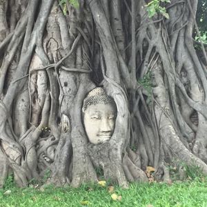 木の根に埋もれた仏像の頭。観光客がしてしまう失礼な行いの注意点を教えてもらってからの写真撮影。