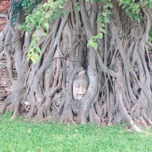 それから、アユタヤ観光!車で1時間半位、クーラーの効いた車の中でお昼寝タイムでした。お目当は何と言ってもワット・プラ・マハタート。不思議な光景です。早速、仏様のお顔より下で写真を撮ります。ガイドさんが上手に撮ってくれました。次は象乗り体験です。これはオプションですが、中々出来ない体験なのでおススメです。大人しい象さんに揺られて貴重な経験をしました。