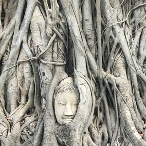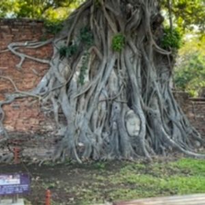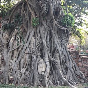 ワットプラマハタート仏頭はワットプラマハタートという仏教寺院の廃墟にあります。仏教遺跡の中でも珍しい菩提樹の根に取り囲まれた世界遺産の仏頭です。これは、菩提樹の木の根が仏頭に絡まったものであり、人為的に作られたものではなく自然に出来たものです。ワットプラマハタートの寺院は当初スリランカ仏教の影響を強く受けていたことからスリランカ式の釣り鐘型の寺院でした。ビルマとの戦争により仏像や寺院は廃墟と化してしまいましたが、寺院内には仏頭をはじめ多くのみどころがあります。