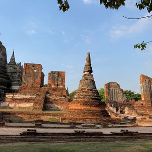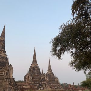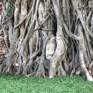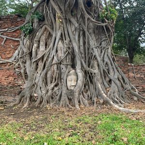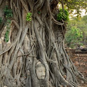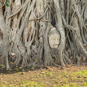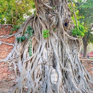 ワットプラマハタート仏頭はワットプラマハタートという仏教寺院の廃墟にあります。仏教遺跡の中でも珍しい菩提樹の根に取り囲まれた世界遺産の仏頭です。これは、菩提樹の木の根が仏頭に絡まったものであり、人為的に作られたものではなく自然に出来たものです。ワットプラマハタートの寺院は当初スリランカ仏教の影響を強く受けていたことからスリランカ式の釣り鐘型の寺院でした。ビルマとの戦争により仏像や寺院は廃墟と化してしまいましたが、寺院内には仏頭をはじめ多くのみどころがあります。