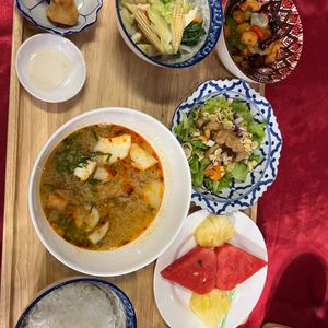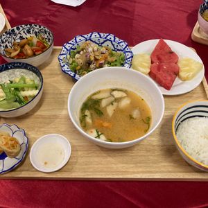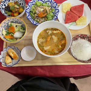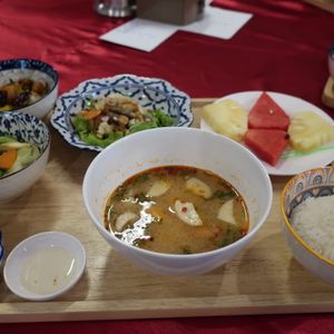 昼食のメイン料理はトムヤムクンで、副菜なども美味しく、タイ料理を満喫できます。