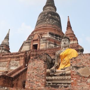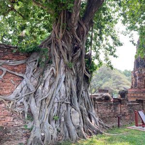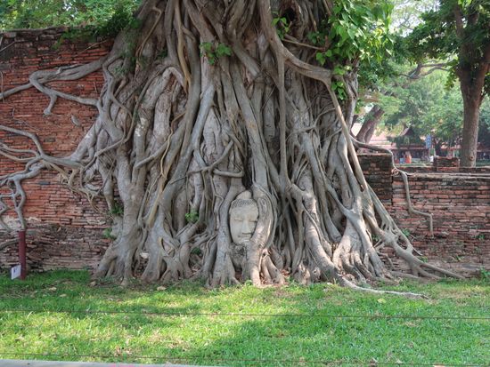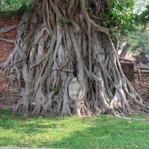 ワットプラマハタート仏頭はワットプラマハタートという仏教寺院の廃墟にあります。仏教遺跡の中でも珍しい菩提樹の根に取り囲まれた世界遺産の仏頭です。これは、菩提樹の木の根が仏頭に絡まったものであり、人為的に作られたものではなく自然に出来たものです。ワットプラマハタートの寺院は当初スリランカ仏教の影響を強く受けていたことからスリランカ式の釣り鐘型の寺院でした。ビルマとの戦争により仏像や寺院は廃墟と化してしまいましたが、寺院内には仏頭をはじめ多くのみどころがあります。