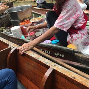 タイの水上マーケットは一度は体験したい。特に手漕ぎボートでの水べりのお土産屋さん巡りは楽しい。バンコク市内の有名どころの寺院を効率よく巡る初心者お勧めなコースです。昼食のホテルブッフェでは屋台風の麺コーナーがお勧めです。